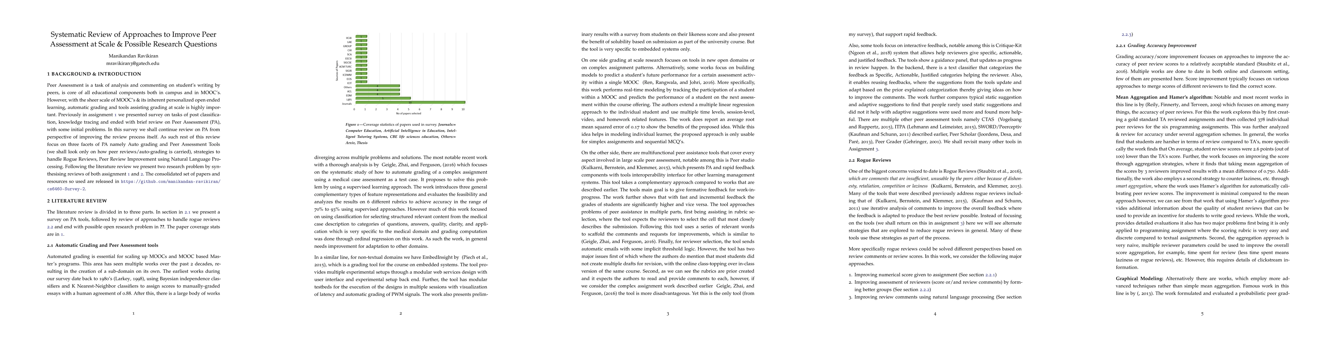 This systematic review examines methods to improve peer assessment in large-scale educational settings, focusing on auto grading tools, strategies to manage rogue reviews, and peer review enhancements using natural language processing. The findings aim to refine the peer review process in both traditional and MOOC environments.
