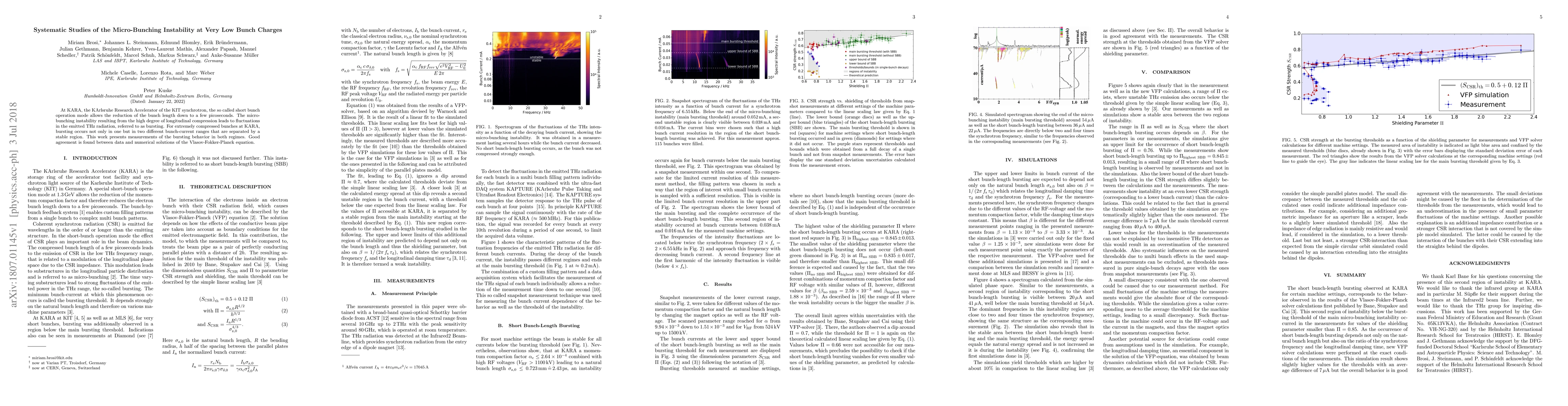The research conducted systematic studies of the micro-bunching instability at very low bunch charges using KARA, the KArlsruhe Research Accelerator, by measuring the bursting behavior in two current ranges separated by a stable region and comparing the data with numerical solutions of the Vlasov-Fokker-Planck equation.
