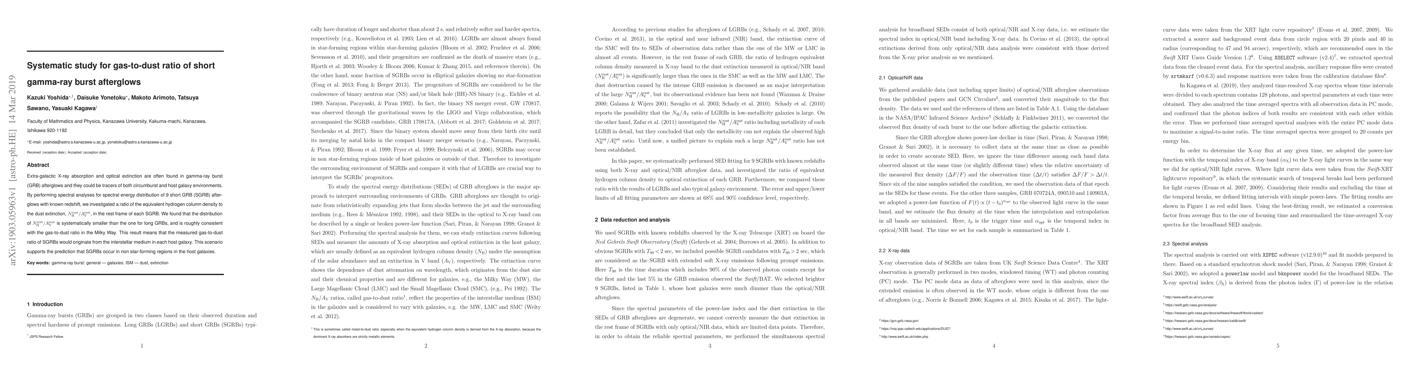 This study investigates the gas-to-dust ratio in short gamma-ray burst (SGRB) afterglows, finding that it aligns with the Milky Way's ratio, suggesting SGRBs occur in non-star-forming regions. The analysis of 9 SGRBs shows a systematically lower N^{rest}_{H}/A^{rest}_{V} ratio compared to long GRBs.