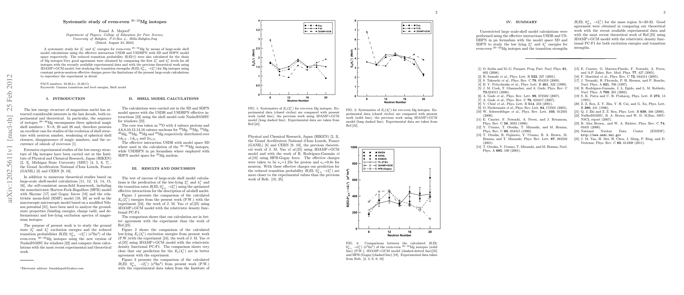 Researchers studied even-even magnesium isotopes using shell model calculations to predict 2+1 and 4+1 energy levels and transition probabilities, achieving good agreement with experimental data but highlighting limitations in reproducing detailed experimental results.