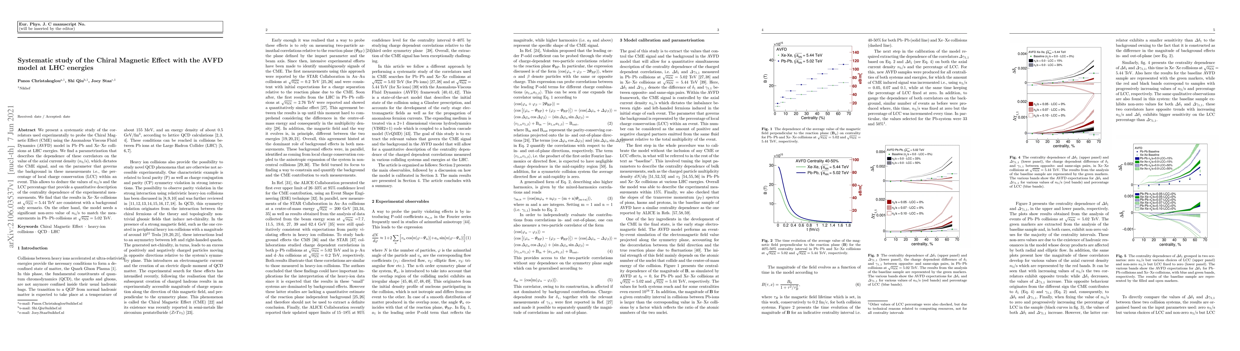 This study systematically explores the Chiral Magnetic Effect (CME) using the AVFD model in Pb-Pb and Xe-Xe collisions at LHC energies. It finds that Xe-Xe collisions at $sqrt{s_{mathrm{NN}}} = 5.44$ TeV align with a background-only scenario, while Pb-Pb collisions at $sqrt{s_{mathrm{NN}}} = 5.02$ TeV require a significant non-zero CME signal ($n_5/mathrm{s}$) to match experimental measurements.