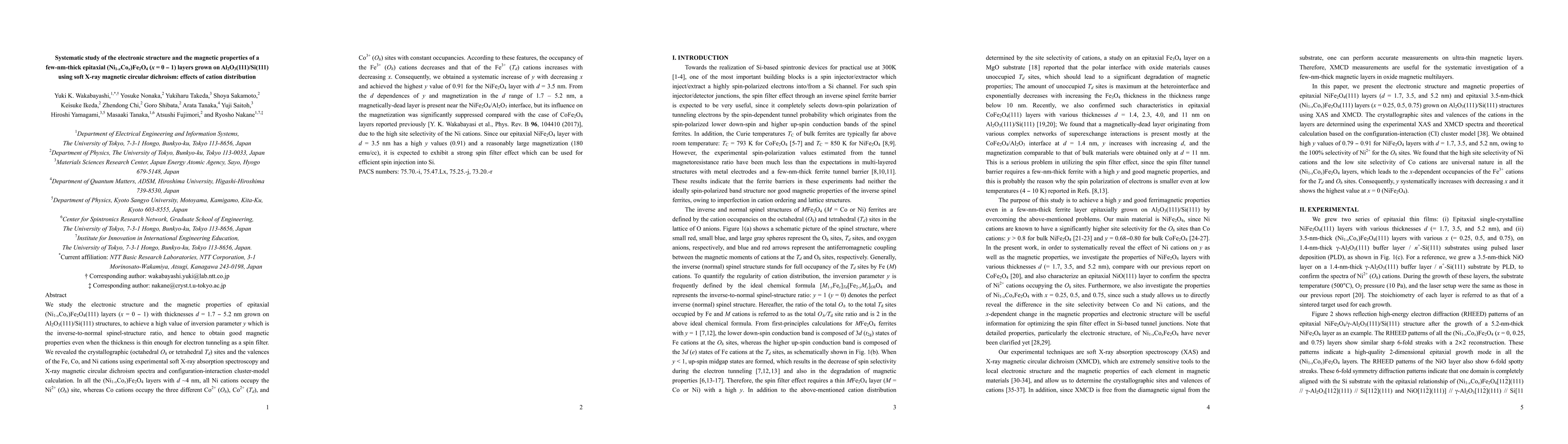 The study investigates thin (Ni1-xCox)Fe2O4 layers on Al2O3(111)/Si(111), revealing cation distribution impacts on magnetic properties. Using soft X-ray absorption spectroscopy and cluster-model calculations, researchers determined cation valences and occupancies. As x (Co concentration) decreases, y (inversion parameter) increases, peaking at 0.91 for a 3.5 nm NiFe2O4 layer. This high y and substantial magnetization suggest potential for efficient spin injection into Si.