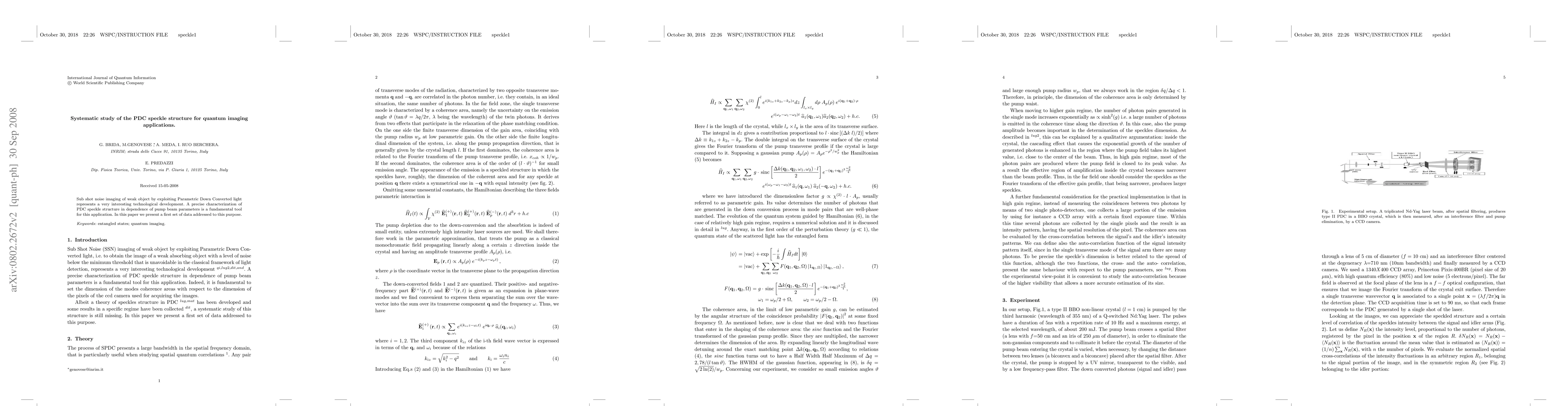 This research provides a systematic study of Parametric Down Converted (PDC) speckle structures for quantum imaging applications, aiming to achieve sub shot noise imaging of weak objects. The paper presents initial data to characterize PDC speckle structure based on pump beam parameters, which is crucial for advancing this technological development.
