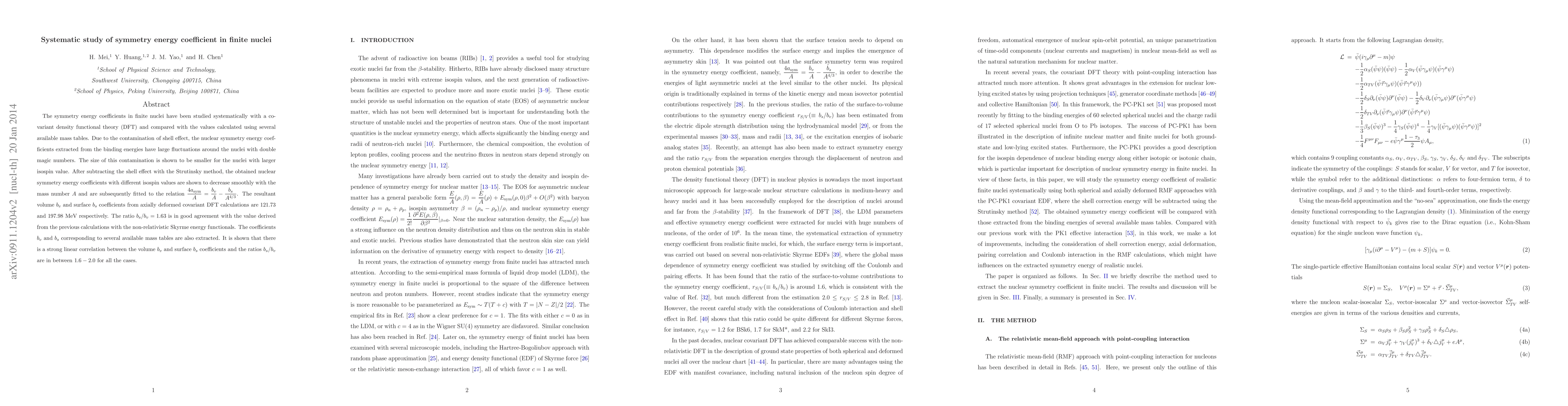 The symmetry energy coefficients in finite nuclei have been studied systematically with a covariant density functional theory (DFT) and compared with the values calculated using several available mass tables. Due to the contamination of shell effect, the nuclear symmetry energy coefficients extracted from the binding energies have large fluctuations around the nuclei with double magic numbers. The size of this contamination is shown to be smaller for the nuclei with larger isospin value. After subtracting the shell effect with the Strutinsky method, the obtained nuclear symmetry energy coefficients with different isospin values are shown to decrease smoothly with the mass number $A$ and are subsequently fitted to the relation $\dfrac{4a_{\rm sym}}{A}=\dfrac{b_v}{A}-\dfrac{b_s}{A^{4/3}}$. The resultant volume $b_v$ and surface $b_s$ coefficients from axially deformed covariant DFT calculations are $121.73$ and $197.98$ MeV respectively. The ratio $b_s/b_v=1.63$ is in good agreement with the value derived from the previous calculations with the non-relativistic Skyrme energy functionals. The coefficients $b_v$ and $b_s$ corresponding to several available mass tables are also extracted. It is shown that there is a strong linear correlation between the volume $b_v$ and surface $b_s$ coefficients and the ratios $b_s/b_v$ are in between $1.6-2.0$ for all the cases.