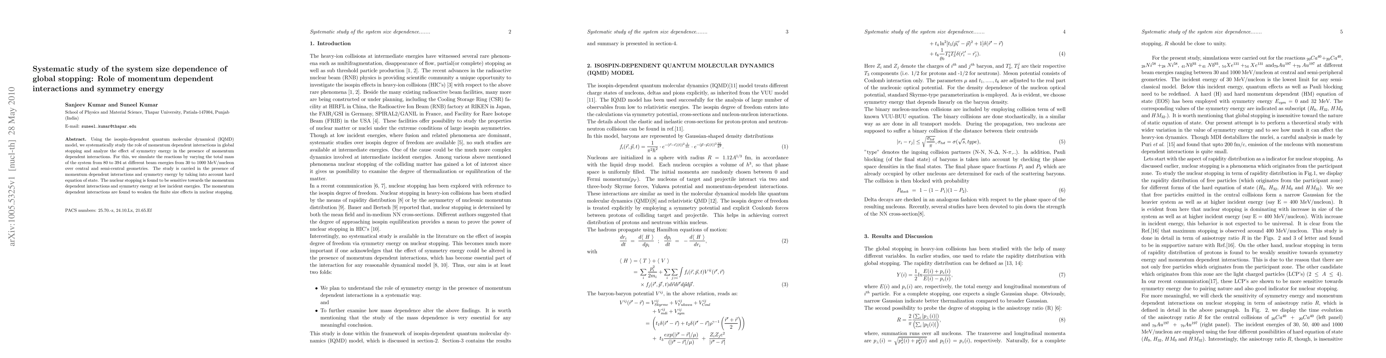 This study investigates the system size dependence of global stopping in heavy-ion collisions using the IQMD model, focusing on the role of momentum-dependent interactions and symmetry energy. Results show that nuclear stopping is significantly influenced by these factors, especially at low energies, and that momentum-dependent interactions mitigate finite size effects.