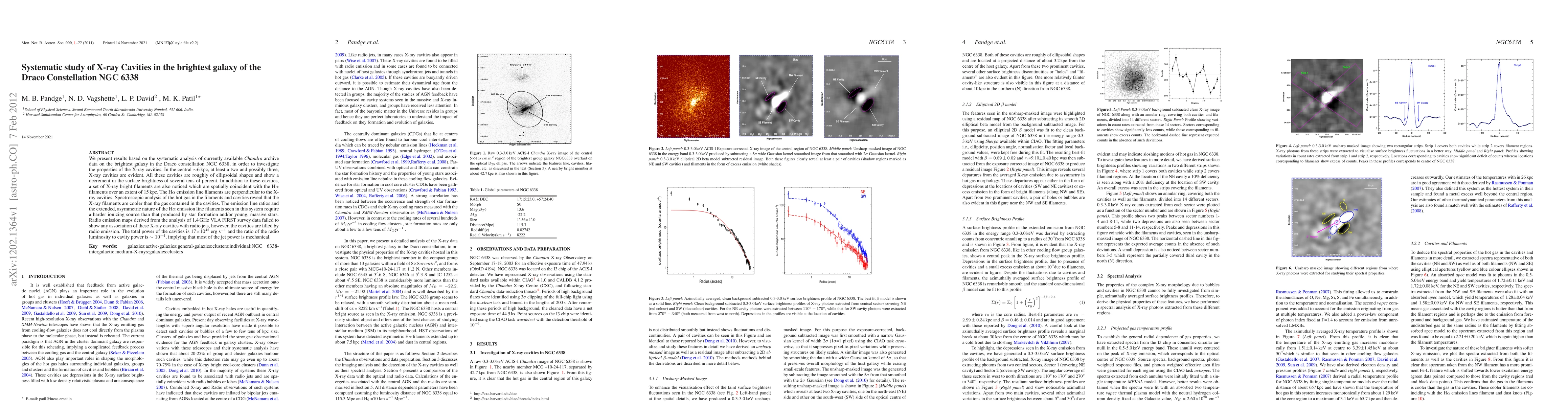We present results based on the systematic analysis of currently available Chandra archive data on the brightest galaxy in the Draco constellation NGC 6338, in order to investigate the properties of the X-ray cavities. In the central ~6 kpc, at least a two and possibly three, X-ray cavities are evident. All these cavities are roughly of ellipsoidal shapes and show a decrement in the surface brightness of several tens of percent. In addition to these cavities, a set of X-ray bright filaments are also noticed which are spatially coincident with the H{\alpha} filaments over an extent of 15 kpc. The H{\alpha} emission line filaments are perpendicular to the X- ray cavities. Spectroscopic analysis of the hot gas in the filaments and cavities reveal that the X-ray filaments are cooler than the gas contained in the cavities. The emission line ratios and the extended, asymmetric nature of the H{\alpha} emission line filaments seen in this system require a harder ionizing source than that produced by star formation and/or young, massive stars. Radio emission maps derived from the analysis of 1.4 GHz VLA FIRST survey data failed to show any association of these X-ray cavities with radio jets, however, the cavities are filled by radio emission. The total power of the cavities is 17\times 1042 erg s-1 and the ratio of the radio luminosity to cavity power is ~ 10-4, implying that most of the jet power is mechanical.