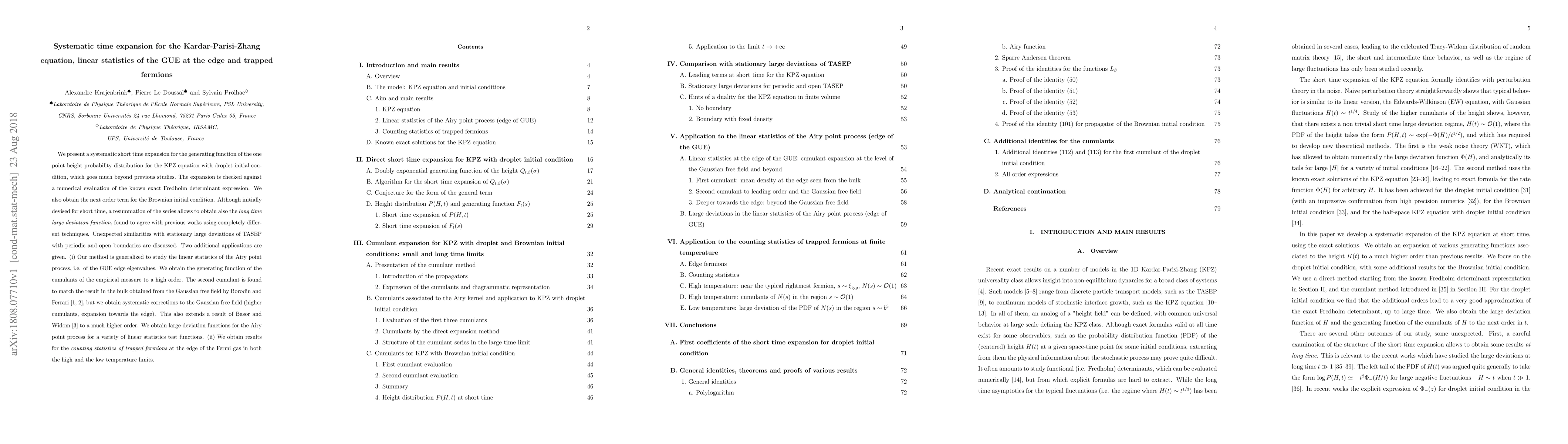 We present a systematic short time expansion for the generating function of the one point height probability distribution for the KPZ equation with droplet initial condition, which goes much beyond previous studies. The expansion is checked against a numerical evaluation of the known exact Fredholm determinant expression. We also obtain the next order term for the Brownian initial condition. Although initially devised for short time, a resummation of the series allows to obtain also the \textit{long time large deviation function}, found to agree with previous works using completely different techniques. Unexpected similarities with stationary large deviations of TASEP with periodic and open boundaries are discussed. Two additional applications are given. (i) Our method is generalized to study the linear statistics of the {Airy point process}, i.e. of the GUE edge eigenvalues. We obtain the generating function of the cumulants of the empirical measure to a high order. The second cumulant is found to match the result in the bulk obtained from the Gaussian free field by Borodin and Ferrari, but we obtain systematic corrections to the Gaussian free field (higher cumulants, expansion towards the edge). This also extends a result of Basor and Widom to a much higher order. We obtain {large deviation functions} for the {Airy point process} for a variety of linear statistics test functions. (ii) We obtain results for the \textit{counting statistics of trapped fermions} at the edge of the Fermi gas in both the high and the low temperature limits.
