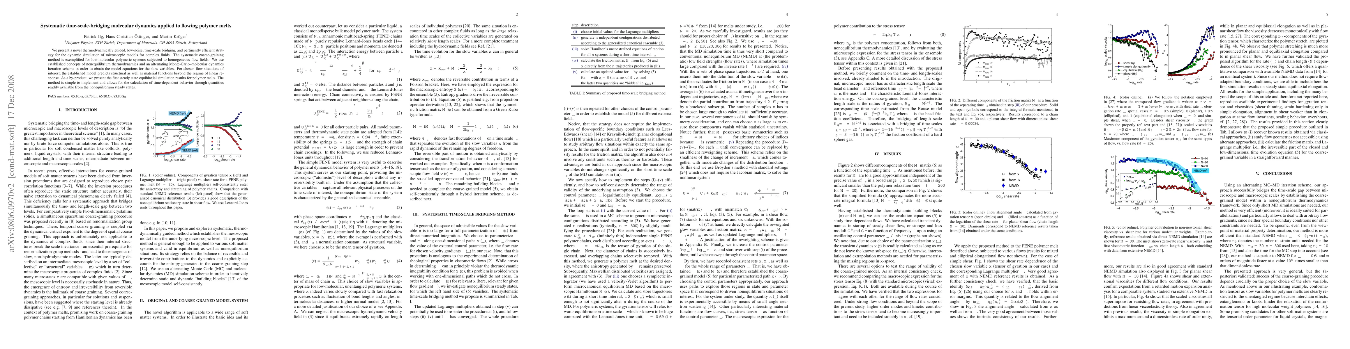 We present a novel thermodynamically guided, low-noise, time-scale bridging, and pertinently efficient strategy for the dynamic simulation of microscopic models for complex fluids. The systematic coarse-graining method is exemplified for low-molecular polymeric systems subjected to homogeneous flow fields. We use established concepts of nonequilibrium thermodynamics and an alternating Monte-Carlo--molecular dynamics iteration scheme in order to obtain the model equations for the slow variables. For chosen flow situations of interest, the established model predicts structural as well as material functions beyond the regime of linear response. As a by-product, we present the first steady state equibiaxial simulation results for polymer melts. The method is simple to implement and allows for the calculation of time-dependent behavior through quantities readily available from the nonequilibrium steady states.