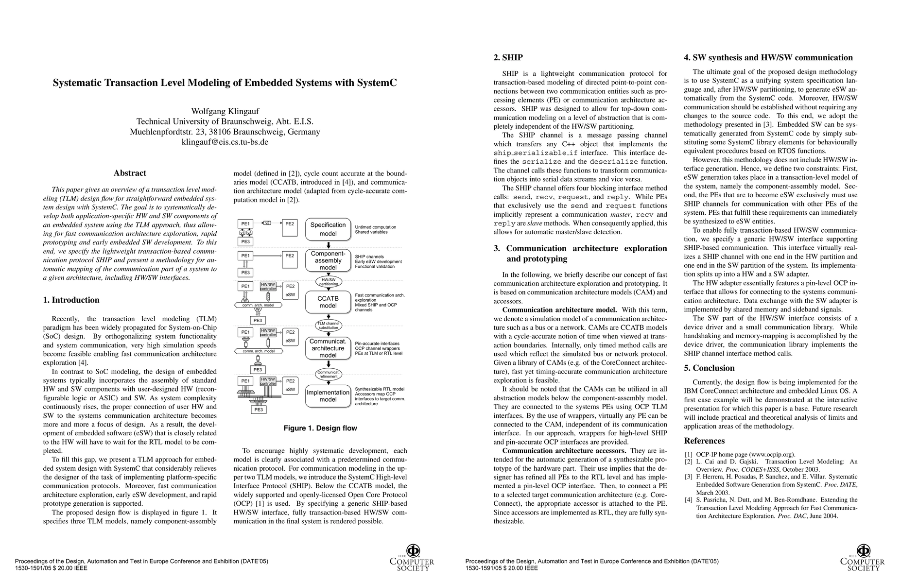 This paper presents a transaction-level modeling design flow for embedded systems using SystemC, focusing on the SHIP protocol for communication and automatic mapping of system components to architectures, facilitating rapid prototyping and early software development.