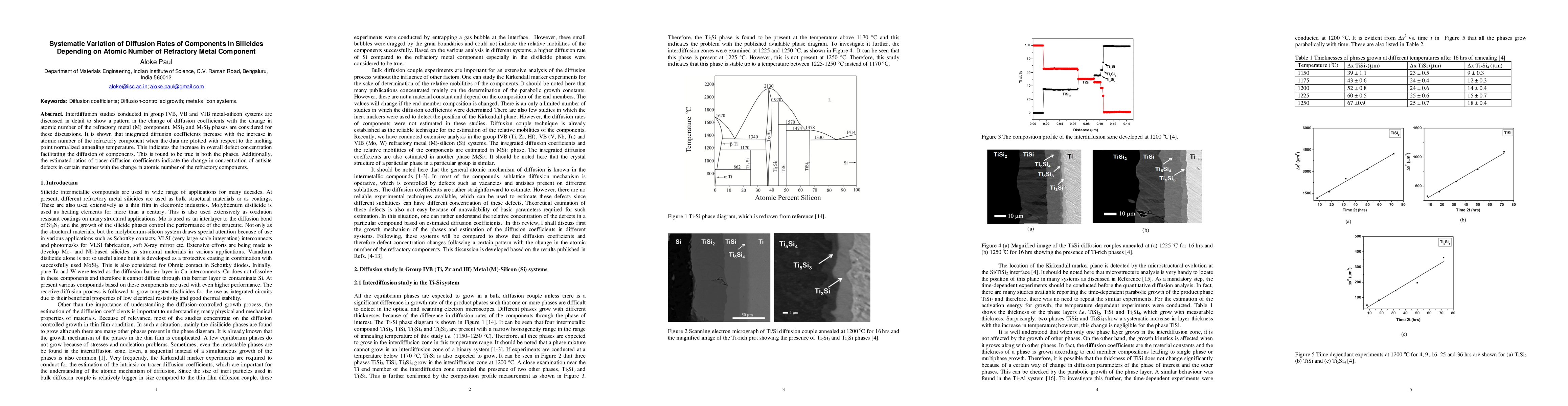 This research examines interdiffusion in metal-silicon systems, focusing on MSi2 and M5Si3 phases. It reveals that diffusion coefficients increase with the atomic number of the refractory metal component when normalized to melting point, indicating higher defect concentrations aiding diffusion. The study also observes changes in antisite defect concentrations with varying atomic numbers of refractory components.