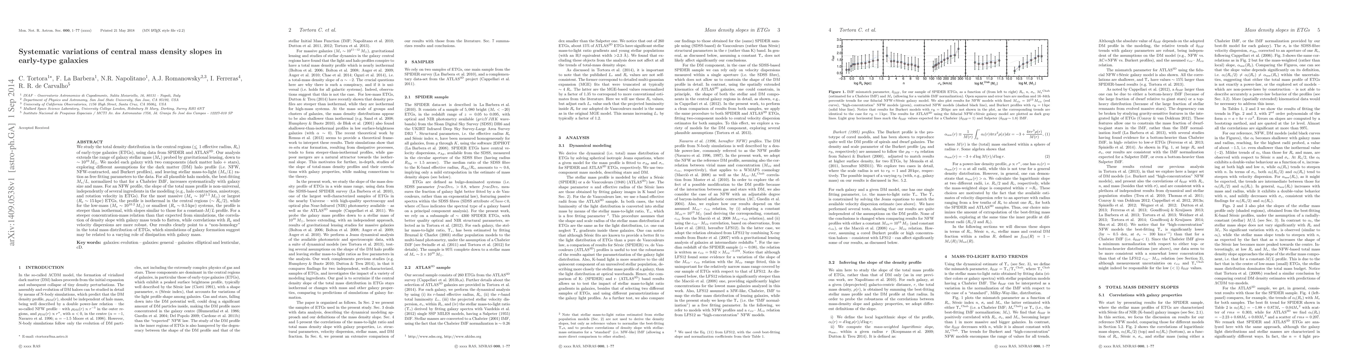 We study the total density distribution in the central regions (~ 1 effective radius, $R_e$) of early-type galaxies (ETGs), using data from SPIDER and $\rm ATLAS^{3D}$. Our analysis extends the range of galaxy stellar mass ($M_{\star}$) probed by gravitational lensing, down to ~ $10^{10}\, \rm M_{\odot}$. We model each galaxy with two components (dark matter halo + stars), exploring different assumptions for the dark matter (DM) halo profile (i.e. NFW, NFW-contracted, and Burkert profiles), and leaving stellar mass-to-light ($M_{\star}/L$) ratios as free fitting parameters to the data. For all plausible halo models, the best-fitting $M_{\star}/L$, normalized to that for a Chabrier IMF, increases systematically with galaxy size and mass. For an NFW profile, the slope of the total mass profile is non-universal, independently of several ingredients in the modeling (e.g., halo contraction, anisotropy, and rotation velocity in ETGs). For the most massive ($M_{\star}$ ~ $10^{11.5} \, M_{\odot}$) or largest ($R_{\rm e}$ ~ $15 \, \rm kpc$) ETGs, the profile is isothermal in the central regions (~$R_{\rm e}/2$), while for the low-mass ($M_{\star}$ ~ $10^{10.2} \, M_\odot$) or smallest ($R_{\rm e}$ ~ $0.5 \, \rm kpc$) systems, the profile is steeper than isothermal, with slopes similar to those for a constant-$M/L$ profile. For a steeper concentration-mass relation than that expected from simulations, the correlation of density slope with galaxy mass tends to flatten, while correlations with $R_{\rm e}$ and velocity dispersions are more robust. Our results clearly point to a "non-homology" in the total mass distribution of ETGs, which simulations of galaxy formation suggest may be related to a varying role of dissipation with galaxy mass.