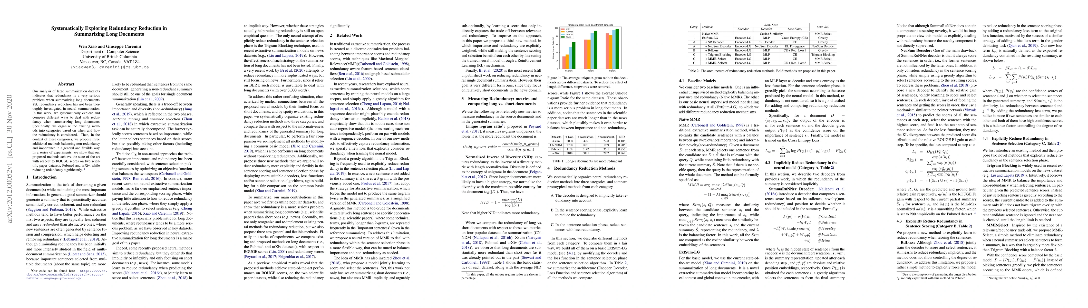 This paper systematically investigates and proposes new methods for reducing redundancy in neural summarization of long documents. It categorizes existing redundancy reduction techniques and introduces three novel approaches that balance non-redundancy with importance, achieving state-of-the-art results on scientific paper datasets while significantly reducing redundancy.