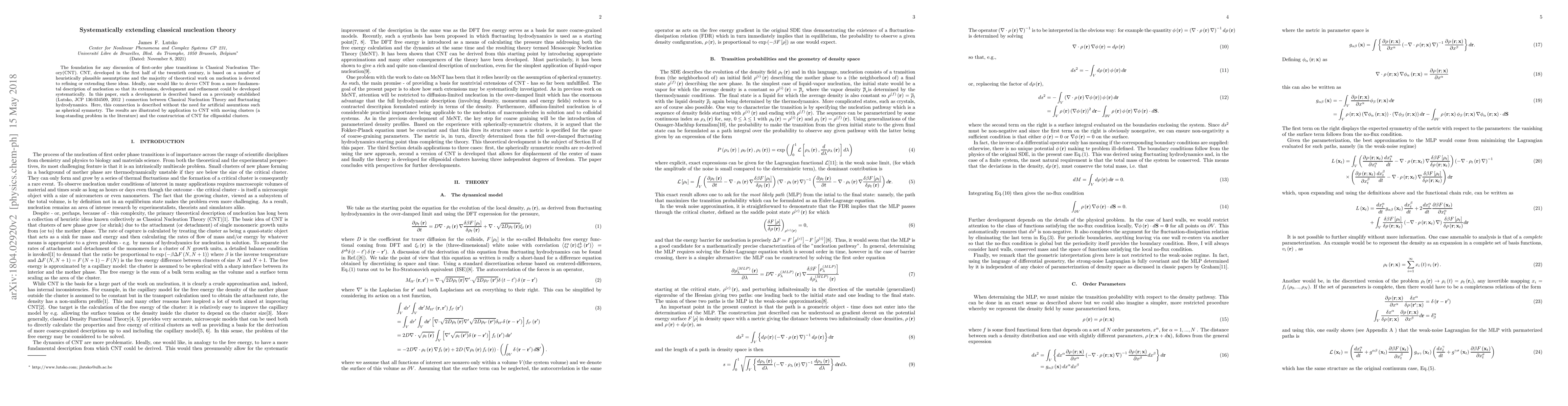 The foundation for any discussion of first-order phse transitions is Classical Nucleation Theory(CNT). CNT, developed in the first half of the twentieth century, is based on a number of heuristically plausible assumtptions and the majority of theoretical work on nucleation is devoted to refining or extending these ideas. Ideally, one would like to derive CNT from a more fundamental description of nucleation so that its extension, development and refinement could be developed systematically. In this paper, such a development is described based on a previously established (Lutsko, JCP 136:034509, 2012 ) connection between Classical Nucleation Theory and fluctuating hydrodynamics. Here, this connection is described without the need for artificial assumtions such as spherical symmetry. The results are illustrated by application to CNT with moving clusters (a long-standing problem in the literature) and the constructrion of CNT for ellipsoidal clusters.