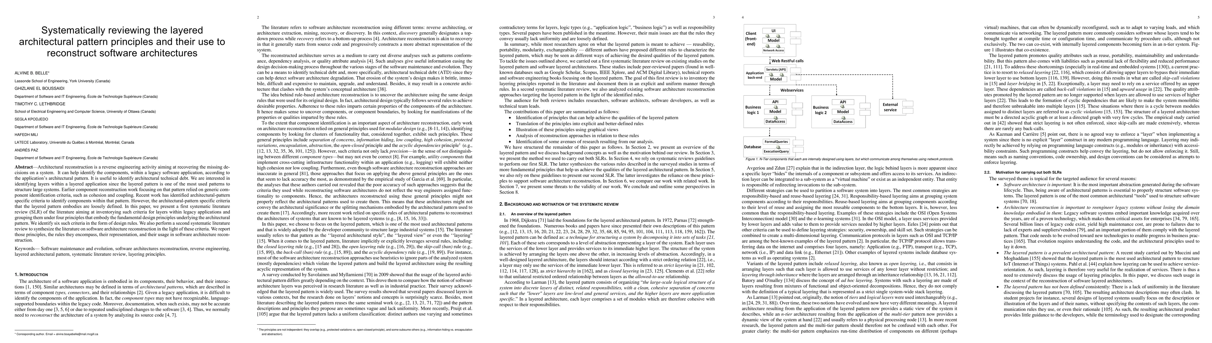 Architectural reconstruction is a reverse engineering activity aiming at recovering the missing decisions on a system. It can help identify the components, within a legacy software application, according to the application's architectural pattern. It is useful to identify architectural technical debt. We are interested in identifying layers within a layered application since the layered pattern is one of the most used patterns to structure large systems. Earlier component reconstruction work focusing on that pattern relied on generic component identification criteria, such as cohesion and coupling. Recent work has identified architectural-pattern specific criteria to identify components within that pattern. However, the architectural-pattern specific criteria that the layered pattern embodies are loosely defined. In this paper, we present a first systematic literature review (SLR) of the literature aiming at inventorying such criteria for layers within legacy applications and grouping them under four principles that embody the fundamental design principles under-lying the architectural pattern. We identify six such criteria in the form of design rules. We also perform a second systematic literature review to synthesize the literature on software architecture reconstruction in the light of these criteria. We report those principles, the rules they encompass, their representation, and their usage in software architecture reconstruction.