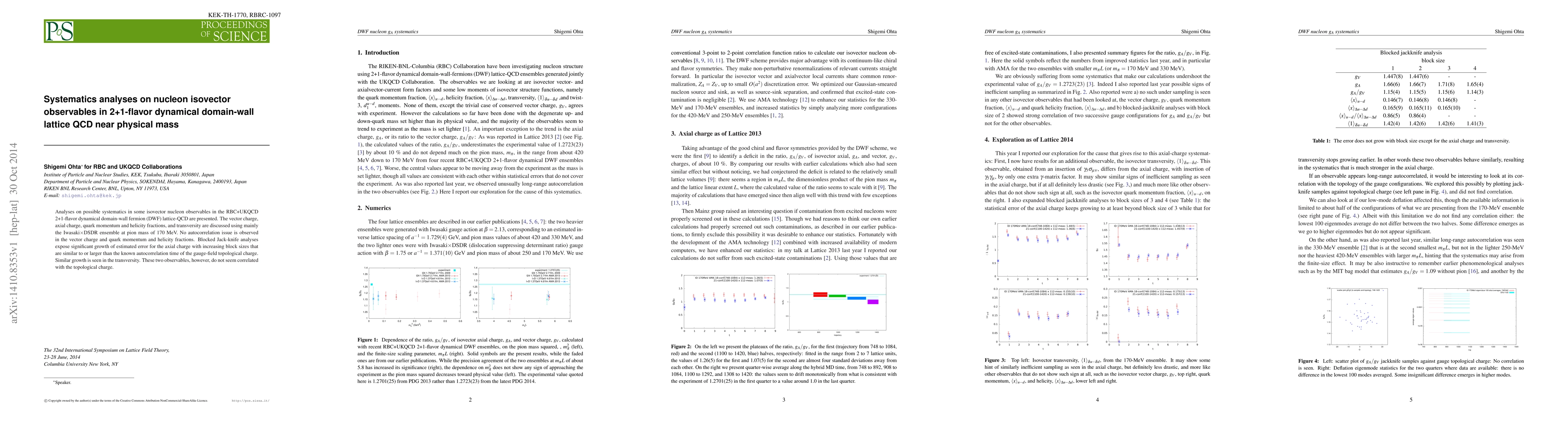 Analyses on possible systematics in some isovector nucleon observables in the RBC+UKQCD 2+1-flavor dynamical domain-wall fermion (DWF) lattice-QCD are presented. The vector charge, axial charge, quark momentum and helicity fractions, and transversity are discussed using mainly the Iwasaki\(\times\)DSDR ensemble at pion mass of 170 MeV. No autocorrelation issue is observed in the vector charge and quark momentum and helicity fractions. Blocked Jack-knife analyses expose significant growth of estimated error for the axial charge with increasing block sizes that are similar to or larger than the known autocorrelation time of the gauge-field topological charge. Similar growth is seen in the transversity. These two observables, however, do not seem correlated with the topological charge.