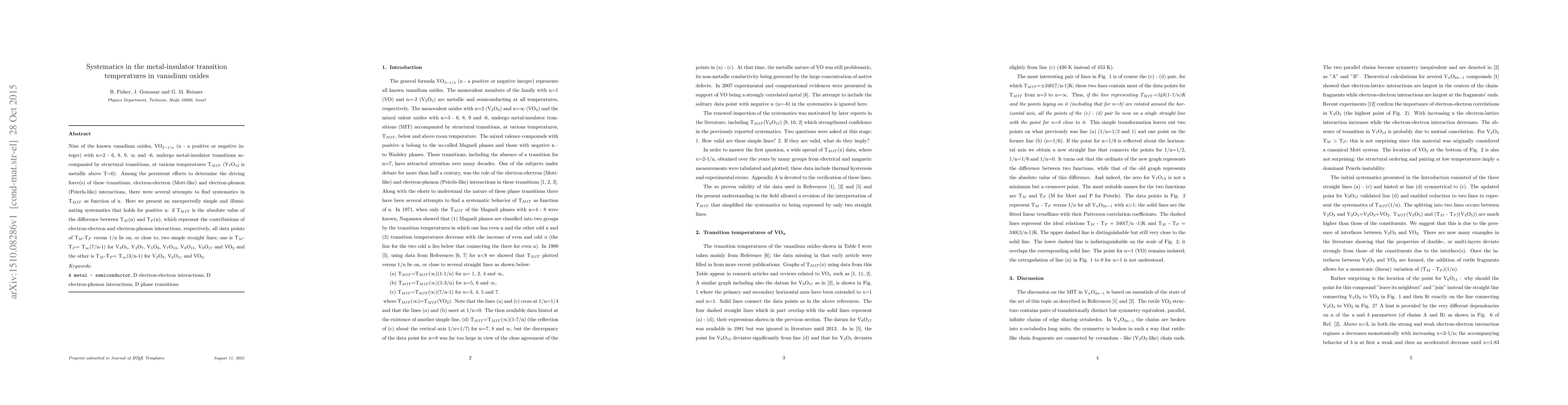 Nine of the known vanadium oxides, VO$_{2-1/n}$ (n - a positive or negative integer) with n=2 - 6, 8, 9, $\infty$ and -6, undergo metal-insulator transitions accompanied by structural transitions, at various temperatures T$_{MIT}$ (V$_7$O$_{13}$ is metallic above T=0). Among the persistent efforts to determine the driving force(s) of these transitions, electron-electron (Mott-like) and electron-phonon (Peierls-like) interactions, there were several attempts to find systematics in T$_{MIT}$ as function of n. Here we present an unexpectedly simple and illuminating systematics that holds for positive n: if T$_{MIT}$ is the absolute value of the difference between T$_M$(n) and T$_P$(n), which represent the contributions of electron-electron and electron-phonon interactions, respectively, all data points of T$_M$-T$_P$ versus 1/n lie on, or close to, two simple straight lines; one is T$_M$-T$_P$= T$_{\infty}$(7/n-1) for V$_3$O$_5$, V$_4$O$_7$, V$_5$O$_9$, V$_7$O$_{13}$, V$_8$O$_{15}$, V$_9$O$_{17}$ and VO$_2$ and the other is T$_M$-T$_P$= T$_{\infty}$(3/n-1) for V$_2$O$_3$, V$_6$O$_{11}$ and VO$_2$.