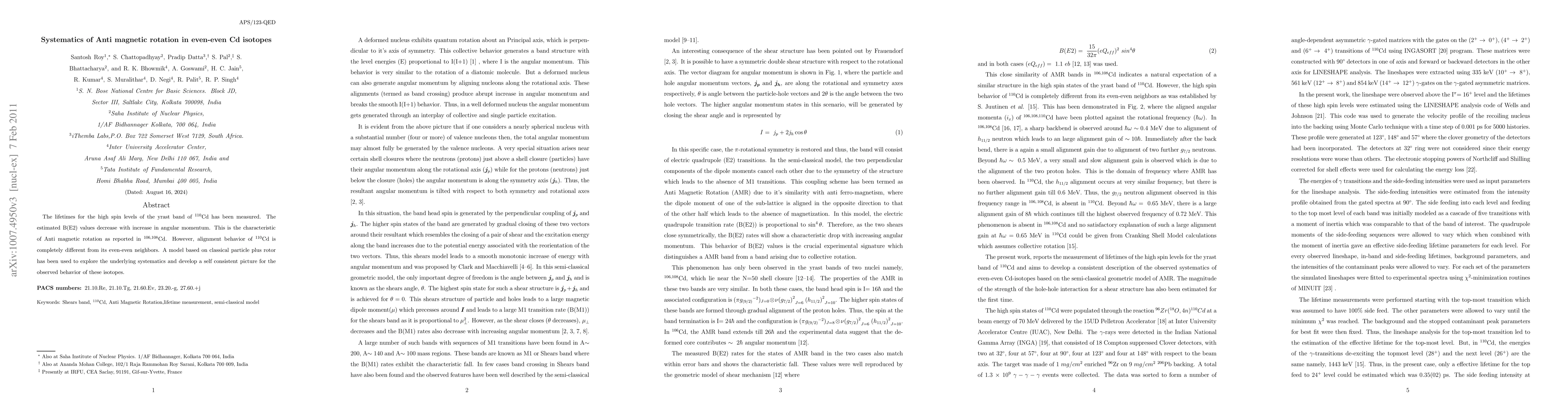 The lifetimes for the high spin levels of the yrast band of $^{110}$Cd has been measured. The estimated B(E2) values decrease with increase in angular momentum. This is the characteristic of Anti magnetic rotation as reported in $^{106,108}$Cd. However, alignment behavior of $^{110}$Cd is completely different from its even-even neighbors. A model based on classical particle plus rotor has been used to explore the underlying systematics and develop a self consistent picture for the observed behavior of these isotopes.