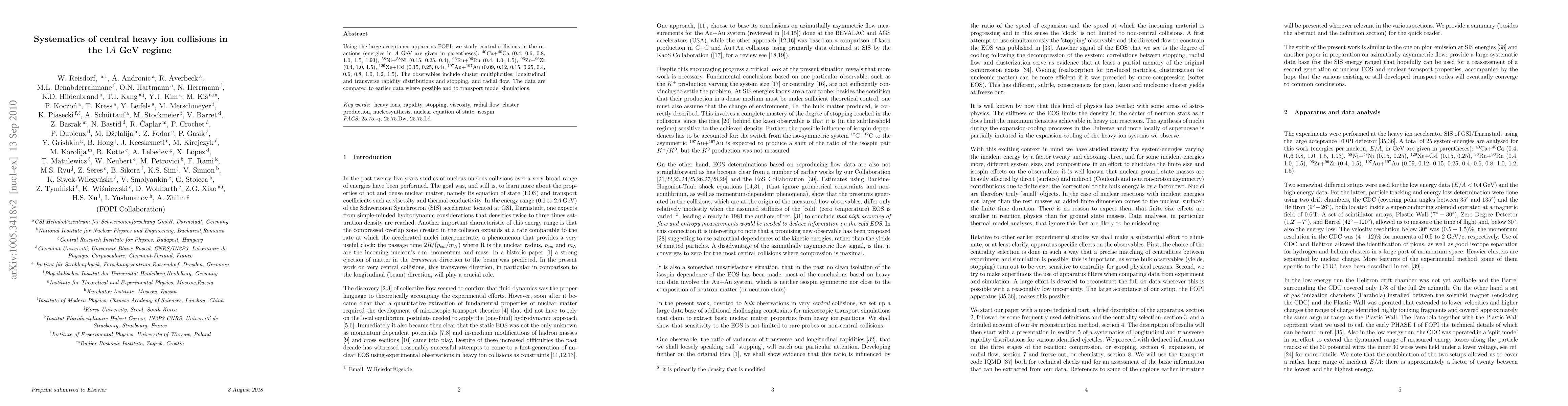 Using the large acceptance apparatus FOPI, we study central collisions in the reactions (energies in A GeV are given in parentheses): 40Ca+40Ca (0.4, 0.6, 0.8, 1.0, 1.5, 1.93), 58Ni+58Ni (0.15, 0.25, 0.4), 96Ru+96Ru (0.4, 1.0, 1.5), 96Zr+96Zr (0.4, 1.0, 1.5), 129Xe+CsI (0.15, 0.25, 0.4), 197Au+197Au (0.09, 0.12, 0.15, 0.25, 0.4, 0.6, 0.8, 1.0, 1.2, 1.5). The observables include cluster multiplicities, longitudinal and transverse rapidity distributions and stopping, and radial flow. The data are compared to earlier data where possible and to transport model simulations.
