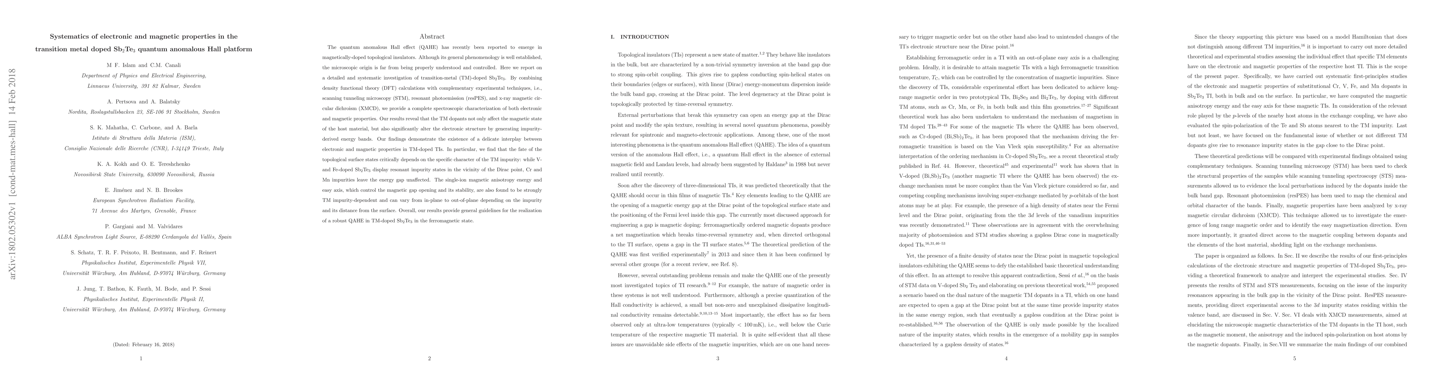 The quantum anomalous Hall effect (QAHE) has recently been reported to emerge in magnetically-doped topological insulators. Although its general phenomenology is well established, the microscopic origin is far from being properly understood and controlled. Here we report on a detailed and systematic investigation of transition-metal (TM)-doped Sb$_2$Te$_3$. By combining density functional theory (DFT) calculations with complementary experimental techniques, i.e., scanning tunneling microscopy (STM), resonant photoemission (resPES), and x-ray magnetic circular dichroism (XMCD), we provide a complete spectroscopic characterization of both electronic and magnetic properties. Our results reveal that the TM dopants not only affect the magnetic state of the host material, but also significantly alter the electronic structure by generating impurity-derived energy bands. Our findings demonstrate the existence of a delicate interplay between electronic and magnetic properties in TM-doped TIs. In particular, we find that the fate of the topological surface states critically depends on the specific character of the TM impurity: while V- and Fe-doped Sb$_2$Te$_3$ display resonant impurity states in the vicinity of the Dirac point, Cr and Mn impurities leave the energy gap unaffected. The single-ion magnetic anisotropy energy and easy axis, which control the magnetic gap opening and its stability, are also found to be strongly TM impurity-dependent and can vary from in-plane to out-of-plane depending on the impurity and its distance from the surface. Overall, our results provide general guidelines for the realization of a robust QAHE in TM-doped Sb$_2$Te$_3$ in the ferromagnetic state.
