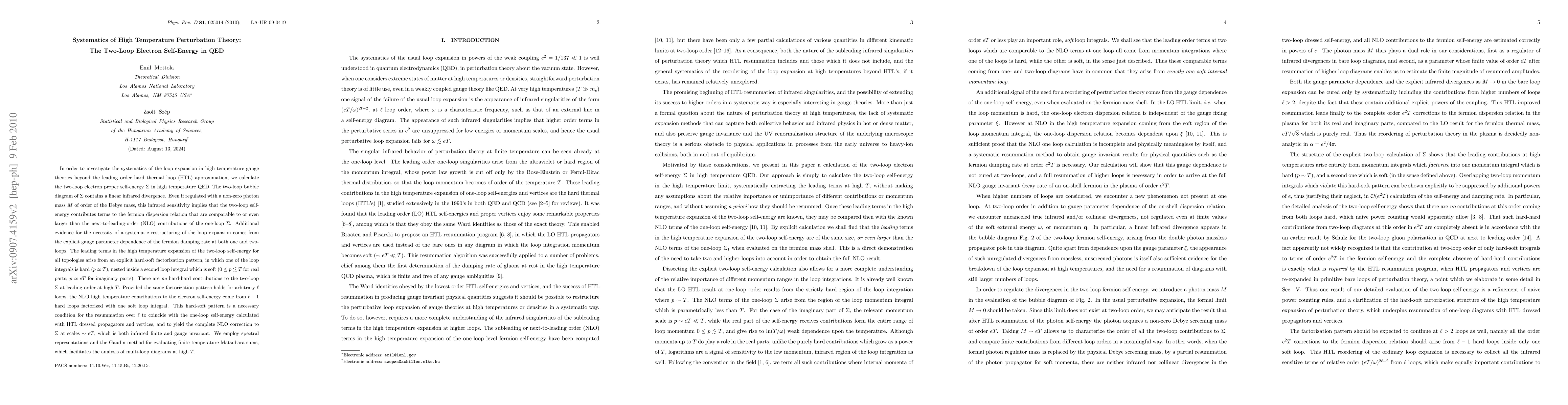 In order to investigate the systematics of the loop expansion in high temperature gauge theories beyond the leading order hard thermal loop (HTL) approximation, we calculate the two-loop electron proper self-energy in high temperature QED. The two-loop bubble diagram contains a linear infrared divergence. Even if regulated with a non-zero photon mass M of order of the Debye mass, this infrared sensitivity implies that the two-loop self-energy contributes terms to the fermion dispersion relation that are comparable to or even larger than the next-to-leading-order (NLO) contributions at one-loop. Additional evidence for the necessity of a systematic restructuring of the loop expansion comes from the explicit gauge parameter dependence of the fermion damping rate at both one and two-loops. The leading terms in the high temperature expansion of the two-loop self-energy for all topologies arise from an explicit hard-soft factorization pattern, in which one of the loop integrals is hard, nested inside a second loop integral which is soft. There are no hard-hard contributions to the two-loop Sigma at leading order at high T. Provided the same factorization pattern holds for arbitrary ell loops, the NLO high temperature contributions to the electron self-energy come from ell-1 hard loops factorized with one soft loop integral. This hard-soft pattern is both a necessary condition for the resummation over ell to coincide with the one-loop self-energy calculated with HTL dressed propagators and vertices, and to yield the complete NLO correction to the self-energy at scales ~eT, which is both infrared finite and gauge invariant. We employ spectral representations and the Gaudin method for evaluating finite temperature Matsubara sums, which facilitates the analysis of multi-loop diagrams at high T.