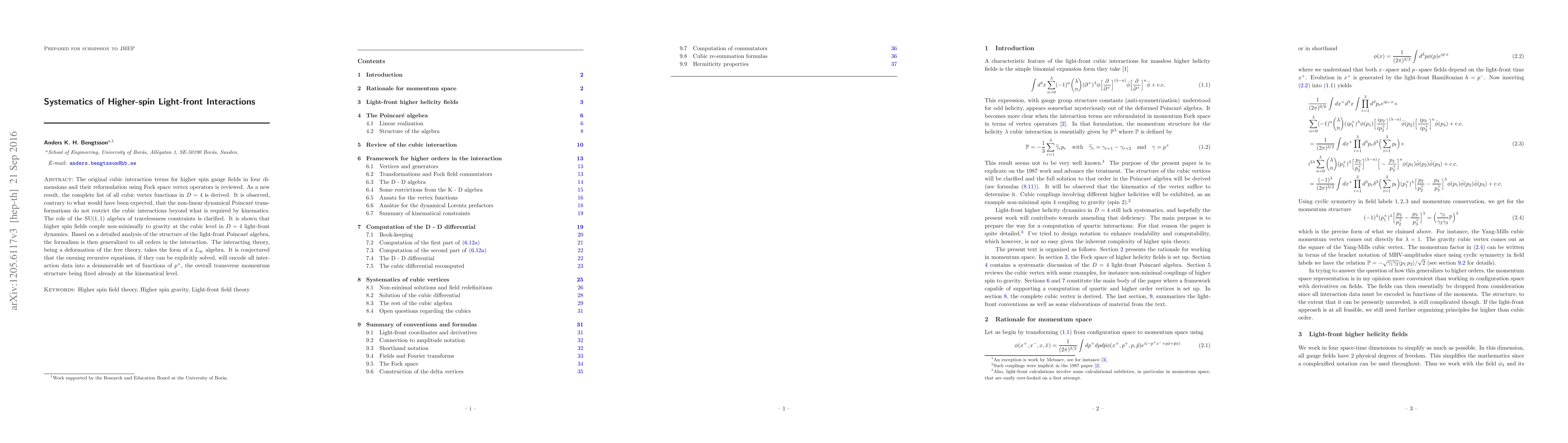 The original cubic interaction terms for higher spin gauge fields in four dimensions and their reformulation using Fock space vertex operators is reviewed. As a new result, the complete list of all cubic vertex functions in D=4 is derived. It is observed, contrary to what would have been expected, that the non-linear dynamical Poincar\'e transformations do not restrict the cubic interactions beyond what is required by kinematics. The role of the SU(1,1) algebra of tracelessness constraints is clarified. It is shown that higher spin fields couple non-minimally to gravity at the cubic level in D=4 light-front dynamics. Based on a detailed analysis of the structure of the light-front Poincar\'e algebra, the formalism is then generalized to all orders in the interaction. The interacting theory, being a deformation of the free theory, takes the form of a strongly homotopy Lie algebra. It is conjectured that the ensuing recursive equations, if they can be explicitly solved, will encode all interaction data into a denumerable set of functions of p+, the overall transverse momentum structure being fixed already at the kinematical level.