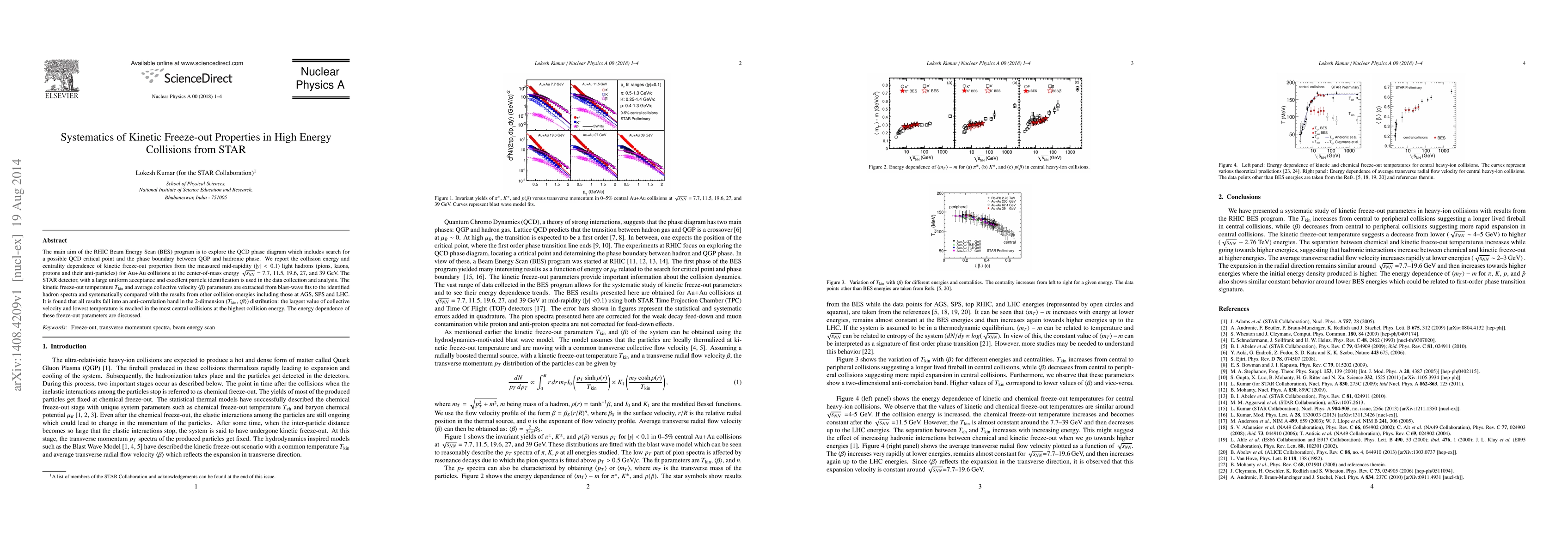 Researchers studied how particles behave in high-energy collisions using data from the STAR detector, finding that kinetic freeze-out temperature and collective velocity change in a specific way with energy and centrality.