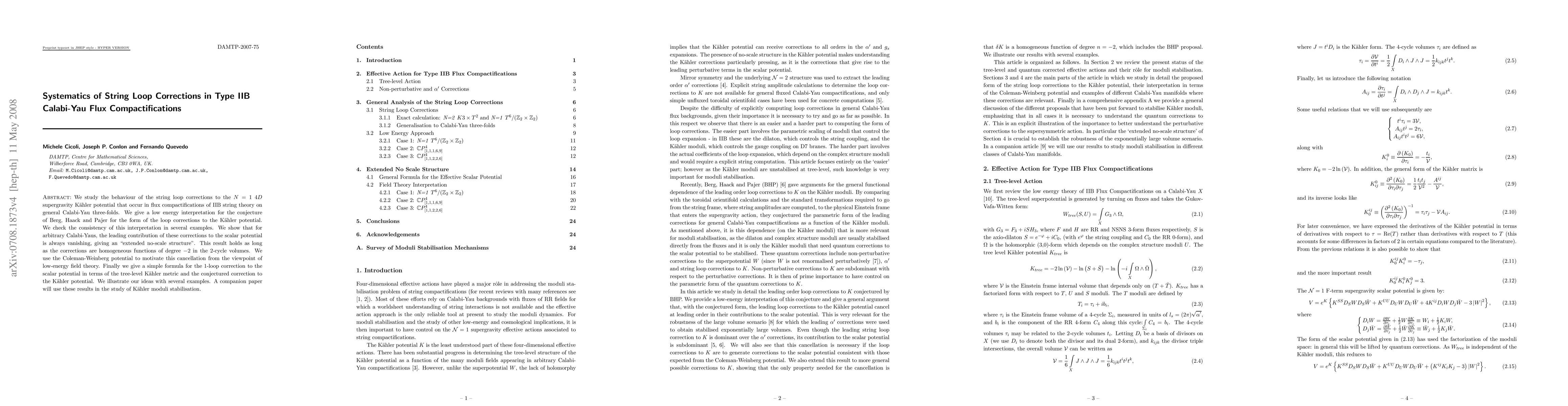 We study the behaviour of the string loop corrections to the N=1 4D supergravity Kaehler potential that occur in flux compactifications of IIB string theory on general Calabi-Yau three-folds. We give a low energy interpretation for the conjecture of Berg, Haack and Pajer for the form of the loop corrections to the Kaehler potential. We check the consistency of this interpretation in several examples. We show that for arbitrary Calabi-Yaus, the leading contribution of these corrections to the scalar potential is always vanishing, giving an "extended no-scale structure". This result holds as long as the corrections are homogeneous functions of degree -2 in the 2-cycle volumes. We use the Coleman-Weinberg potential to motivate this cancellation from the viewpoint of low-energy field theory. Finally we give a simple formula for the 1-loop correction to the scalar potential in terms of the tree-level Kaehler metric and the correction to the Kaehler potential. We illustrate our ideas with several examples. A companion paper will use these results in the study of Kaehler moduli stabilisation.