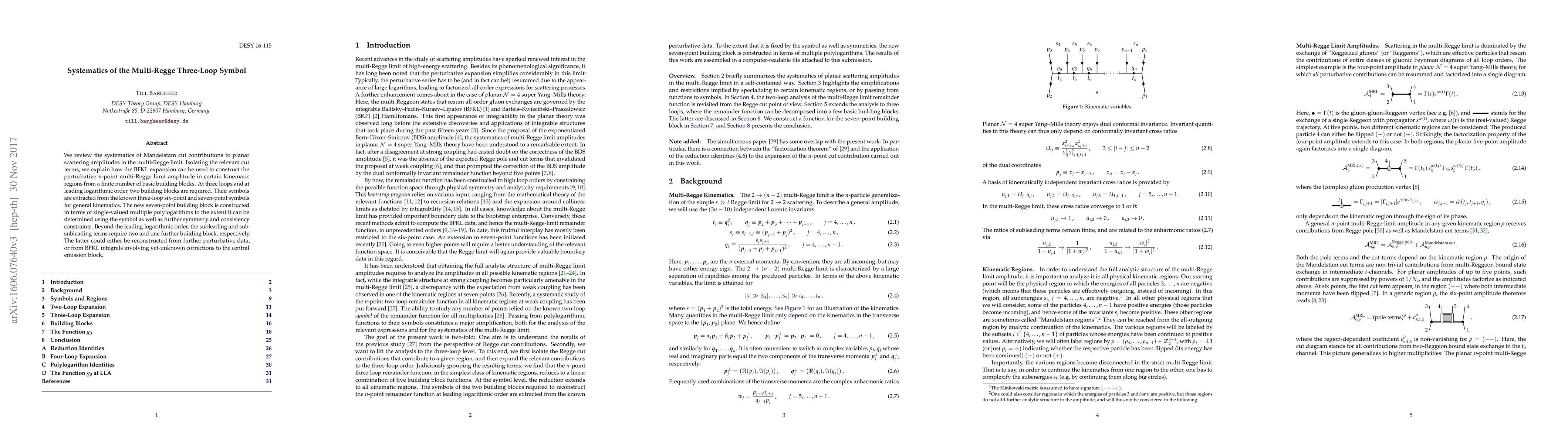 We review the systematics of Mandelstam cut contributions to planar scattering amplitudes in the multi-Regge limit. Isolating the relevant cut terms, we explain how the BFKL expansion can be used to construct the perturbative n-point multi-Regge limit amplitude in certain kinematic regions from a finite number of basic building blocks. At three loops and at leading logarithmic order, two building blocks are required. Their symbols are extracted from the known three-loop six-point and seven-point symbols for general kinematics. The new seven-point building block is constructed in terms of single-valued multiple polylogarithms to the extent it can be determined using the symbol as well as further symmetry and consistency constraints. Beyond the leading logarithmic order, the subleading and sub-subleading terms require two and one further building block, respectively. The latter could either be reconstructed from further perturbative data, or from BFKL integrals involving yet-unknown corrections to the central emission block.