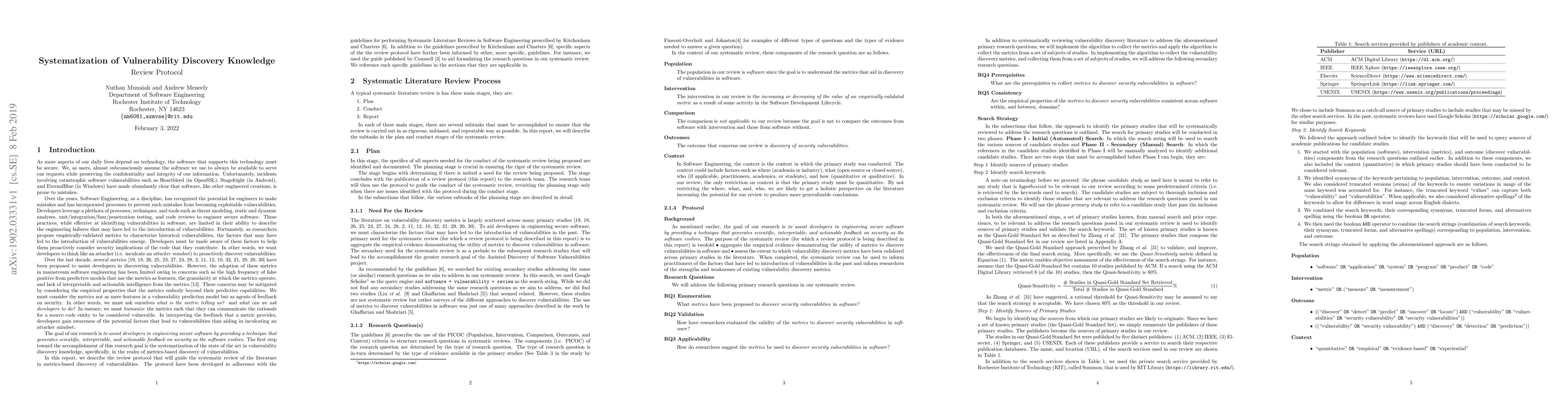 In this report, we describe the review protocol that will guide the systematic review of the literature in metrics-based discovery of vulnerabilities. The protocol have been developed in adherence with the guidelines for performing Systematic Literature Reviews in Software Engineering prescribed by Kitchenham and Charters.