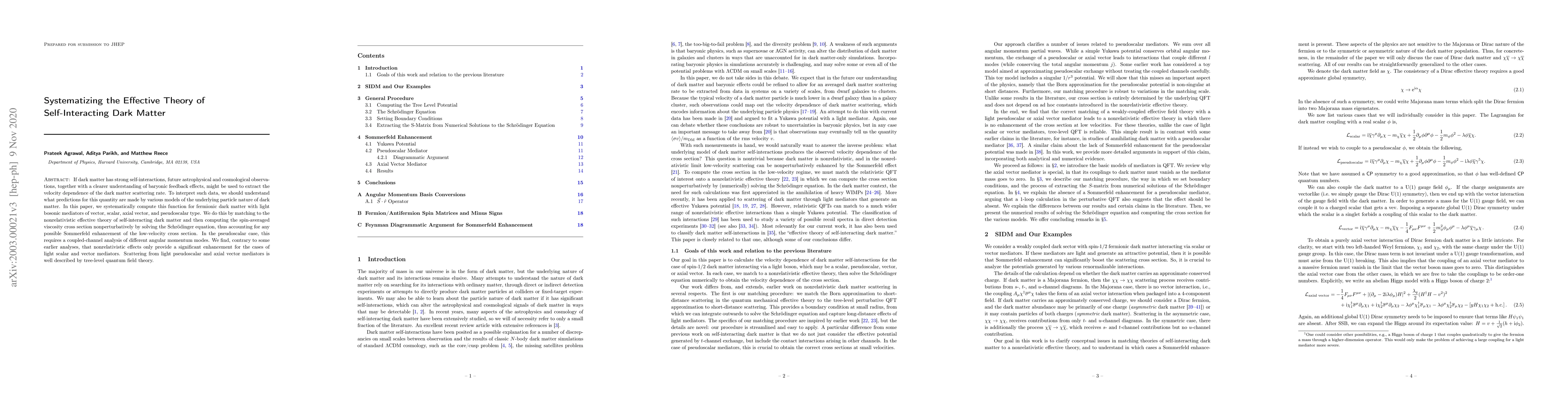If dark matter has strong self-interactions, future astrophysical and cosmological observations, together with a clearer understanding of baryonic feedback effects, might be used to extract the velocity dependence of the dark matter scattering rate. To interpret such data, we should understand what predictions for this quantity are made by various models of the underlying particle nature of dark matter. In this paper, we systematically compute this function for fermionic dark matter with light bosonic mediators of vector, scalar, axial vector, and pseudoscalar type. We do this by matching to the nonrelativistic effective theory of self-interacting dark matter and then computing the spin-averaged viscosity cross section nonperturbatively by solving the Schrodinger equation, thus accounting for any possible Sommerfeld enhancement of the low-velocity cross section. In the pseudoscalar case, this requires a coupled-channel analysis of different angular momentum modes. We find, contrary to some earlier analyses, that nonrelativistic effects only provide a significant enhancement for the cases of light scalar and vector mediators. Scattering from light pseudoscalar and axial vector mediators is well described by tree-level quantum field theory.
