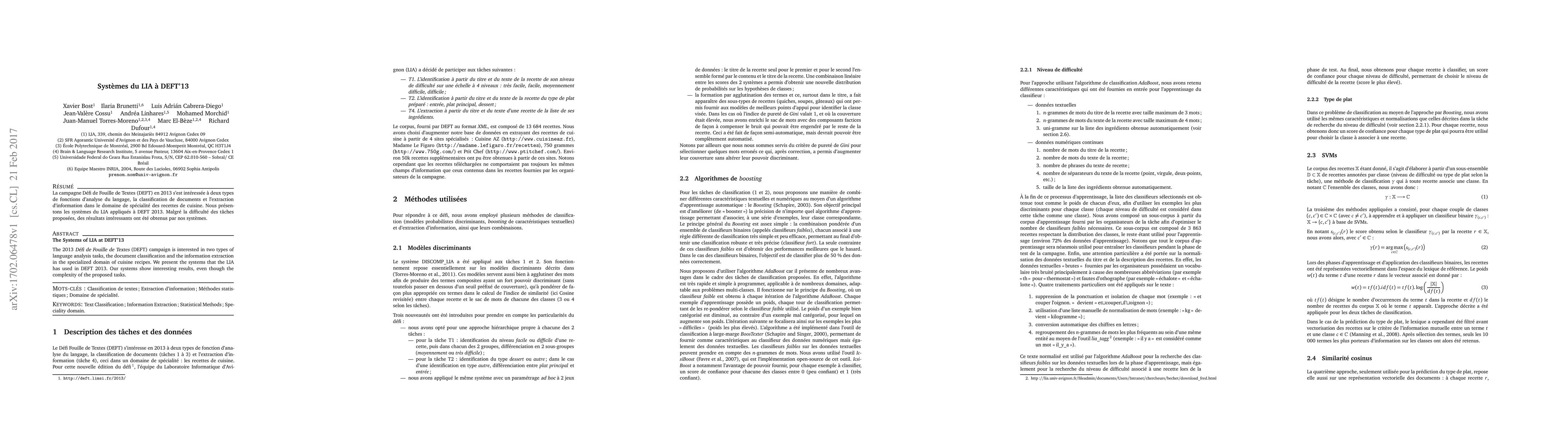 The 2013 D\'efi de Fouille de Textes (DEFT) campaign is interested in two types of language analysis tasks, the document classification and the information extraction in the specialized domain of cuisine recipes. We present the systems that the LIA has used in DEFT 2013. Our systems show interesting results, even though the complexity of the proposed tasks.