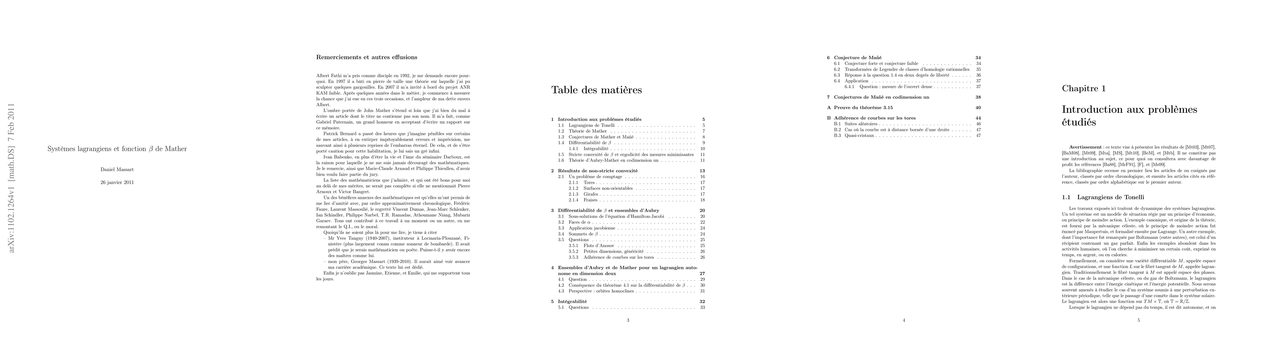 We review the author's results on Mather's $\beta$ function : non-strict convexity of $\beta$ when the configuration space has dimension two, link between the size of the Aubry set and the differentiability of $\beta$, correlation between the rationality of the homology class and the differentiability of $\beta$, equality of the Mather set and the Aubry set for a large number of cohomology classes when the configuration space has dimension two, link beween the differentiability of $\beta$ and the integrability of the system. Ma\~{n}\'e's conjectures are discussed in Chapters 6 and 7. A short list of open problems is given at the end of each chapter. In Appendix A we prove a theorem which extends Theorem 5 of reference [Mt09]. In Appendix B we discuss a geometrical problem which arises from Chapter 3, but may be of independant interest.