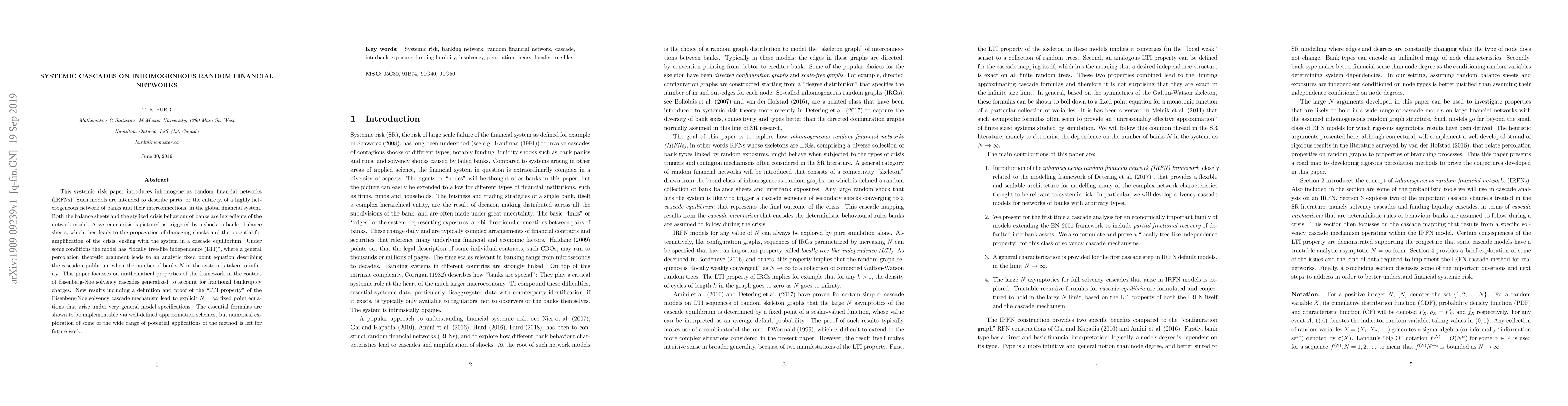 This systemic risk paper introduces inhomogeneous random financial networks (IRFNs). Such models are intended to describe parts, or the entirety, of a highly heterogeneous network of banks and their interconnections, in the global financial system. Both the balance sheets and the stylized crisis behaviour of banks are ingredients of the network model. A systemic crisis is pictured as triggered by a shock to banks' balance sheets, which then leads to the propagation of damaging shocks and the potential for amplification of the crisis, ending with the system in a cascade equilibrium. Under some conditions the model has ``locally tree-like independence (LTI)'', where a general percolation theoretic argument leads to an analytic fixed point equation describing the cascade equilibrium when the number of banks $N$ in the system is taken to infinity. This paper focusses on mathematical properties of the framework in the context of Eisenberg-Noe solvency cascades generalized to account for fractional bankruptcy charges. New results including a definition and proof of the ``LTI property'' of the Eisenberg-Noe solvency cascade mechanism lead to explicit $N=\infty$ fixed point equations that arise under very general model specifications. The essential formulas are shown to be implementable via well-defined approximation schemes, but numerical exploration of some of the wide range of potential applications of the method is left for future work.