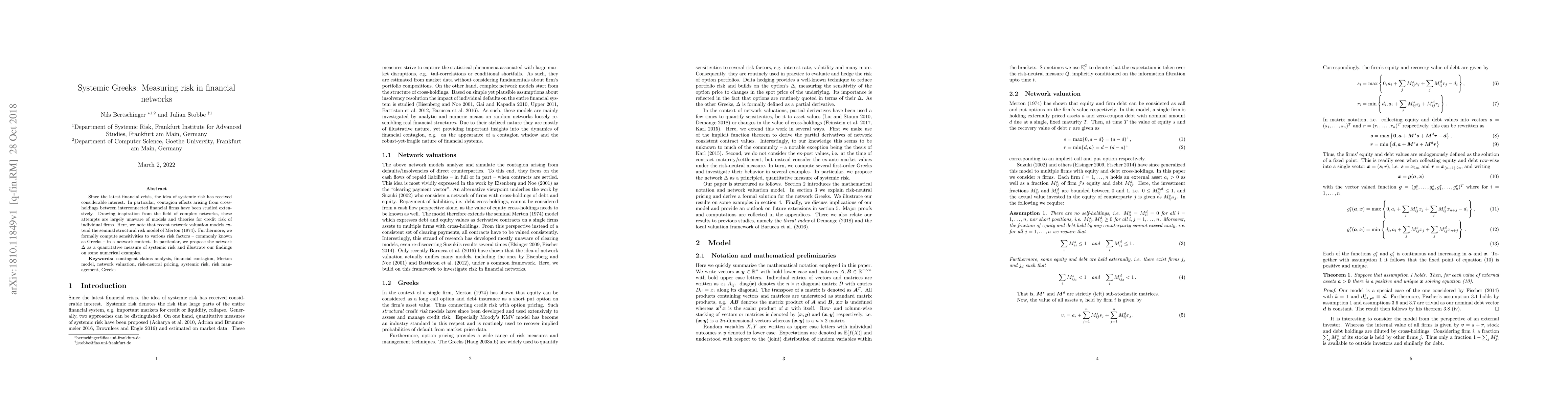 This paper explores systemic risk in financial networks by extending Merton's structural risk model and introduces the network $\Delta$ as a measure of systemic risk. It computes sensitivities to risk factors, known as Greeks, in a network context to quantify contagion effects from interconnected firms.