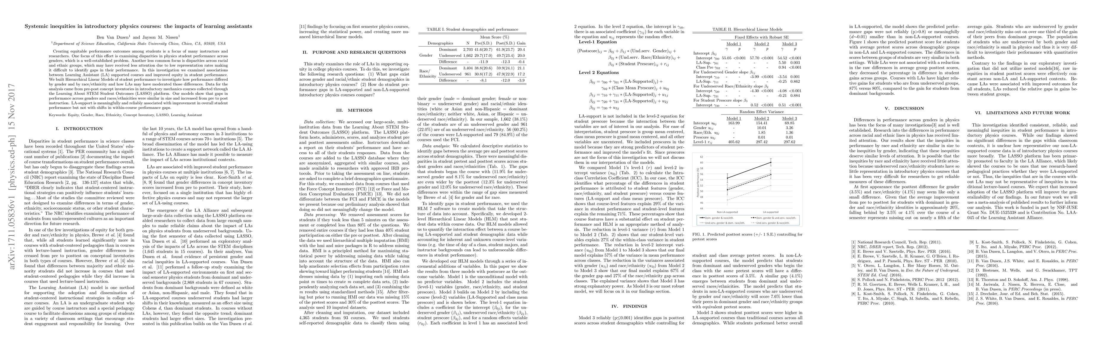 This study investigates the impact of Learning Assistants (LAs) on equity in introductory physics courses, finding that LAs improve overall student performance but do not reduce existing performance gaps between genders and racial/ethnic groups. The research uses hierarchical linear models and data from concept inventories to analyze these disparities.