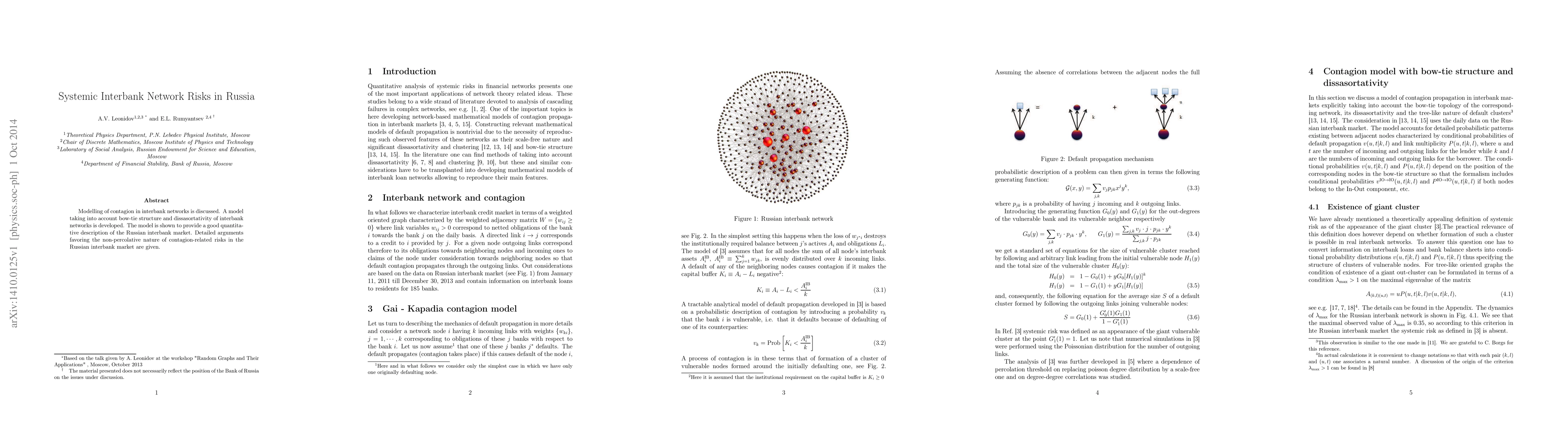 This paper develops a model to analyze contagion in Russia's interbank network, considering its bow-tie structure and disassortativity. The model effectively captures the non-percolative nature of contagion risks in the Russian market, indicating that systemic risks spread in a contained manner.