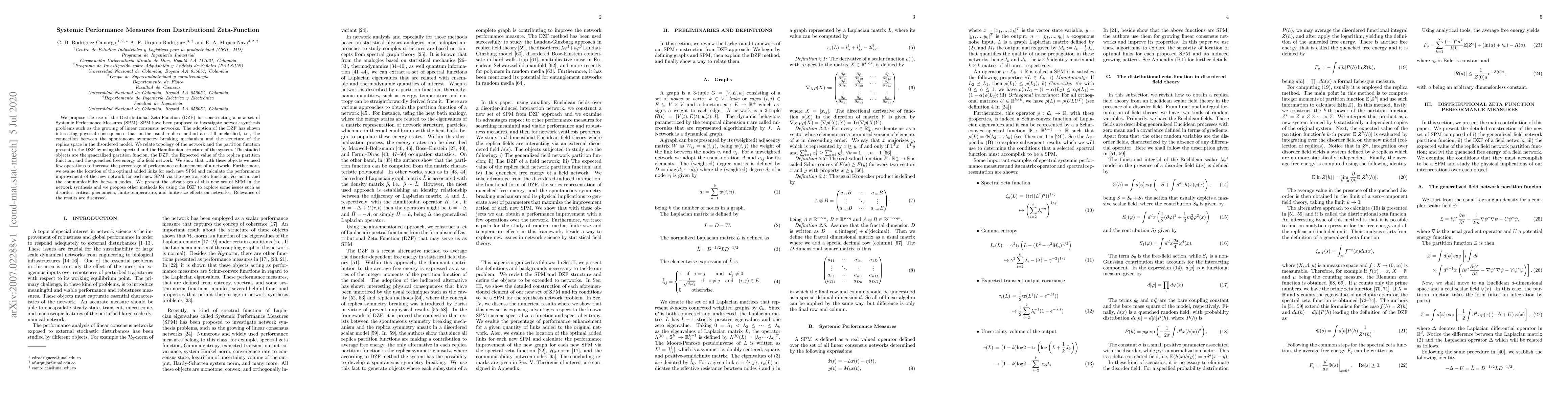 We propose the use of the Distributional Zeta-Function (DZF) for constructing a new set of Systemic Performance Measures (SPM). SPM have been proposed to investigate network synthesis problems such as the growing of linear consensus networks. The adoption of the DZF has shown interesting physical consequences that in the usual replica method are still unclarified, i.e., the connection between the spontaneous symmetry breaking mechanism and the structure of the replica space in the disordered model. We relate topology of the network and the partition function present in the DZF by using the spectral and the Hamiltonian structure of the system. The studied objects are the generalized partition funcion, the DZF, the Expected value of the replica partition function, and the quenched free energy of a field network. We show that with these objects we need few operations to increase the percentage of performance enhancement of a network. Furthermore, we evalue the location of the optimal added links for each new SPM and calculate the performance improvement of the new network for each new SPM via the spectral zeta function, $\mathcal{H}_{2}$-norm, and the communicability between nodes. We present the advantages of this new set of SPM in the network synthesis and we propose other methods for using the DZF to explore some issues such as disorder, critical phenomena, finite-temperature, and finite-size effects on networks. Relevance of the results are discussed.