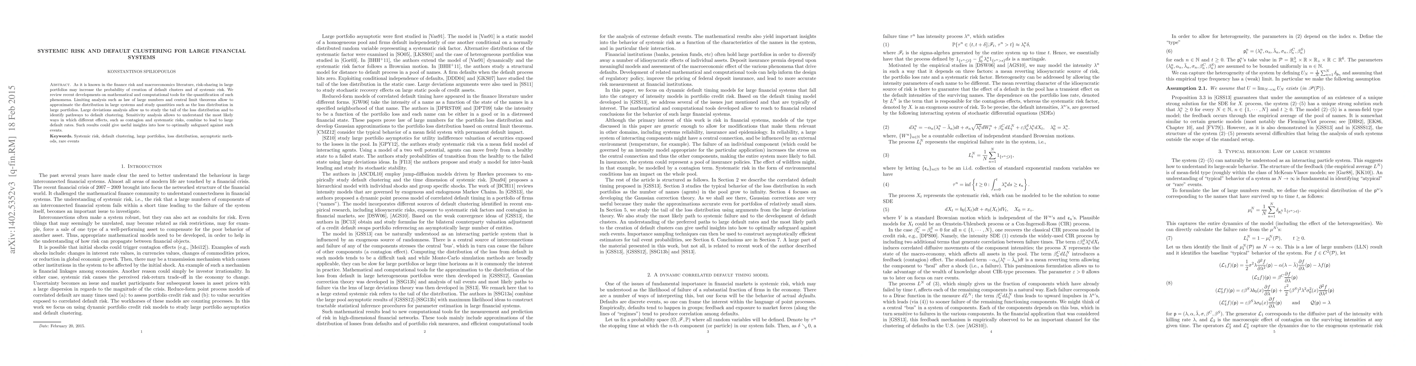 This paper reviews recent advancements in mathematical and computational tools for quantifying systemic risk and default clustering in large financial systems. It employs limiting analysis and large deviations to approximate and study the distribution of losses, aiming to identify pathways to default clustering and understand the interplay of contagion and systemic risks.