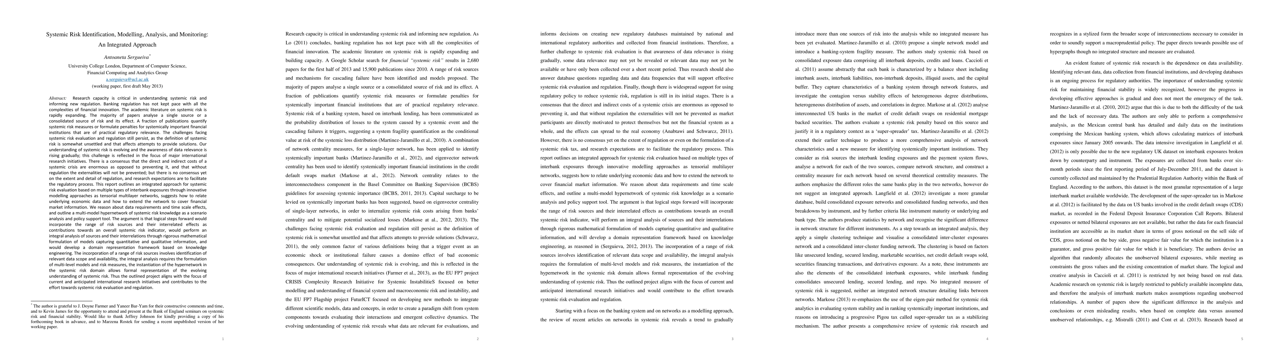 Research capacity is critical in understanding systemic risk and informing new regulation. Banking regulation has not kept pace with all the complexities of financial innovation. The academic literature on systemic risk is rapidly expanding. The majority of papers analyse a single source or a consolidated source of risk and its effect. A fraction of publications quantify systemic risk measures or formulate penalties for systemically important financial institutions that are of practical regulatory relevance. The challenges facing systemic risk evaluation and regulation still persist, as the definition of systemic risk is somewhat unsettled and that affects attempts to provide solutions. Our understanding of systemic risk is evolving and the awareness of data relevance is rising gradually; this challenge is reflected in the focus of major international research initiatives. There is a consensus that the direct and indirect costs of a systemic crisis are enormous as opposed to preventing it, and that without regulation the externalities will not be prevented; but there is no consensus yet on the extent and detail of regulation, and research expectations are to facilitate the regulatory process. This report outlines an integrated approach for systemic risk evaluation based on multiple types of interbank exposures through innovative modelling approaches as tensorial multilayer networks, suggests how to relate underlying economic data and how to extend the network to cover financial market information. We reason about data requirements and time scale effects, and outline a multi-model hypernetwork of systemic risk knowledge as a scenario analysis and policy support tool. The argument is that logical steps forward would incorporate the range of risk sources and their interrelated effects as contributions towards an overall systemic risk indicator, would perform an integral analysis of ...
