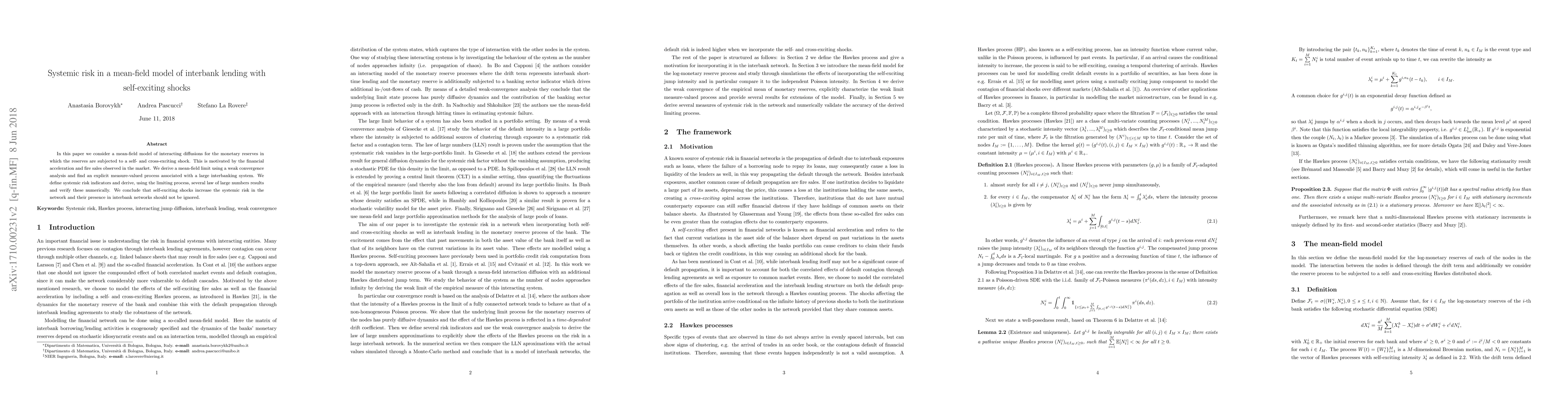 This paper develops a mean-field model for interbank lending with self-exciting shocks, deriving systemic risk indicators and demonstrating that such shocks significantly increase systemic risk in large interbanking networks. Numerical verification supports the theoretical findings, highlighting the importance of considering self-exciting shocks in financial models.