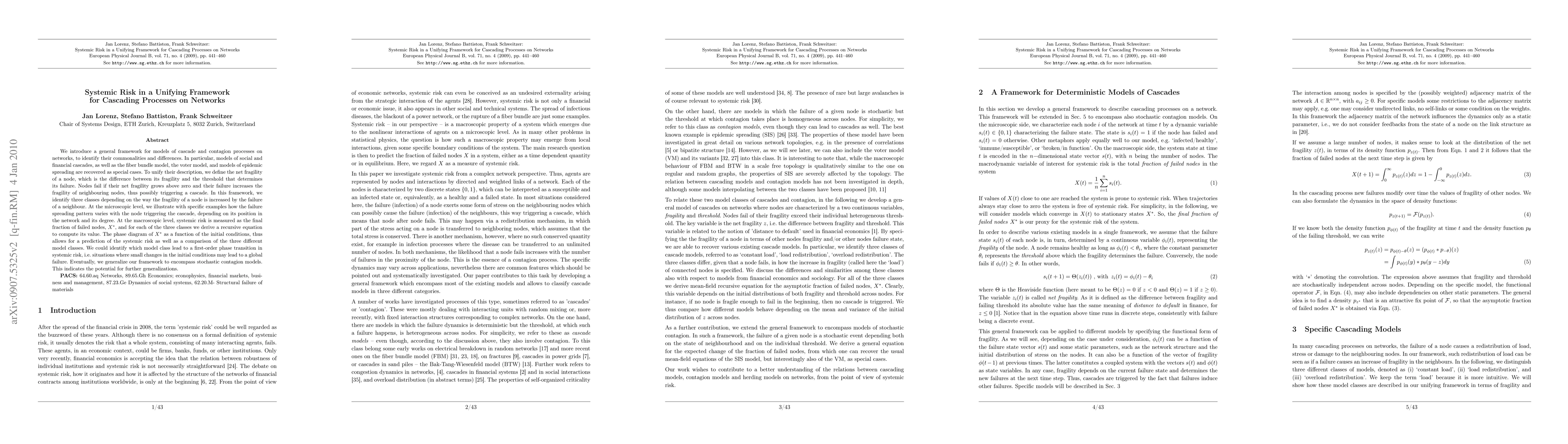 This paper presents a unifying framework for modeling cascade and contagion processes on networks, encompassing various types of cascades like social, financial, and epidemic spreading. It introduces net fragility to describe node failure and identifies three classes of fragility propagation. The framework predicts systemic risk through the final fraction of failed nodes and identifies conditions leading to first-order phase transitions in systemic risk.
