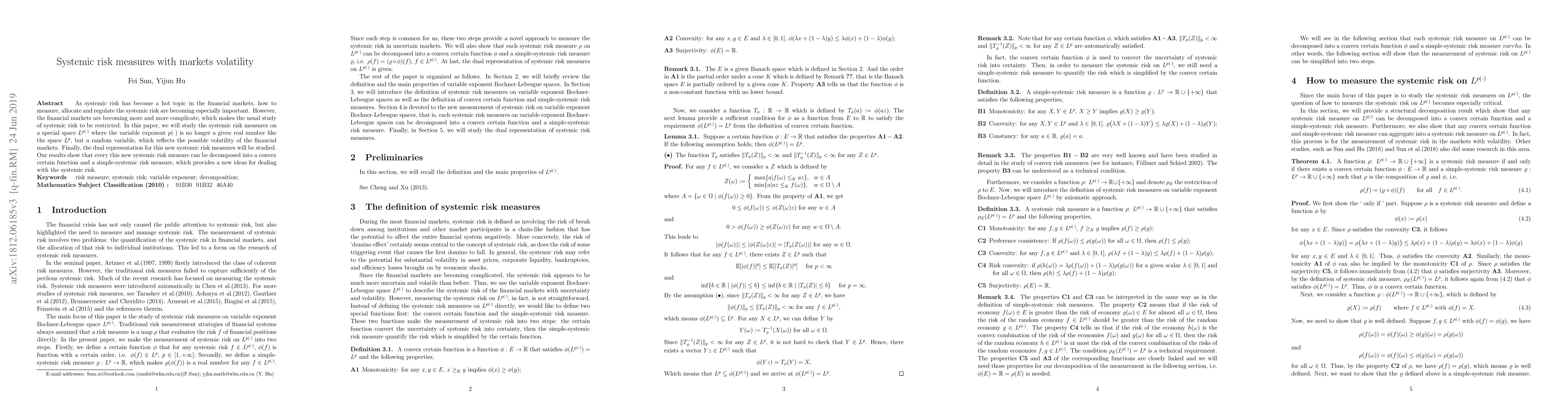 As systemic risk has become a hot topic in the financial markets, how to measure, allocate and regulate the systemic risk are becoming especially important. However, the financial markets are becoming more and more complicate, which makes the usual study of systemic risk to be restricted. In this paper, we will study the systemic risk measures on a special space $L^{p(\cdot)}$ where the variable exponent $p(\cdot)$ is no longer a given real number like the space $L^{p}$, but a random variable, which reflects the possible volatility of the financial markets. Finally, the dual representation for this new systemic risk measures will be studied. Our results show that every this new systemic risk measure can be decomposed into a convex certain function and a simple-systemic risk measure, which provides a new ideas for dealing with the systemic risk.