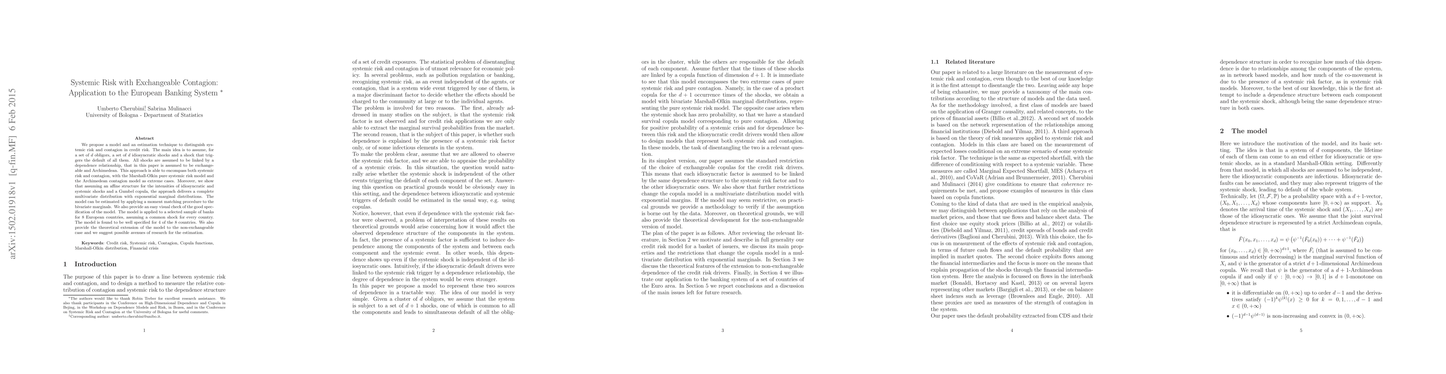 This paper proposes a model to distinguish systemic risk and contagion in credit risk, assuming an exchangeable dependence relationship. The model effectively captures both systemic risk and contagion, and is applied to European banks, showing good fit for four out of eight countries.