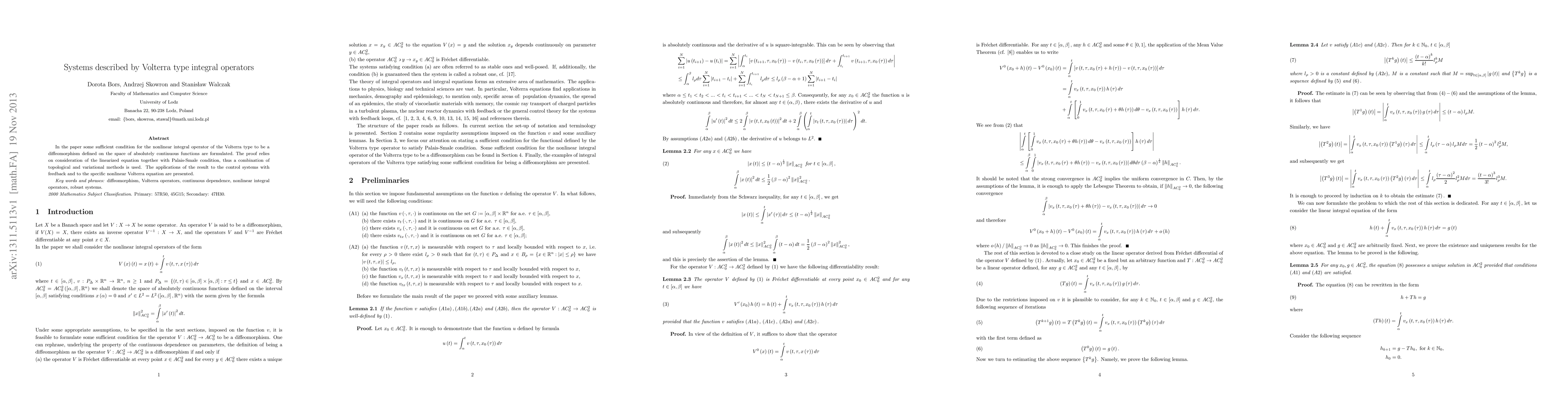 This paper establishes sufficient conditions for a Volterra type integral operator to be a diffeomorphism on the space of absolutely continuous functions, using a combination of topological and variational methods, including the linearized equation and the Palais-Smale condition. Applications to control systems with feedback and specific nonlinear Volterra equations are also discussed.