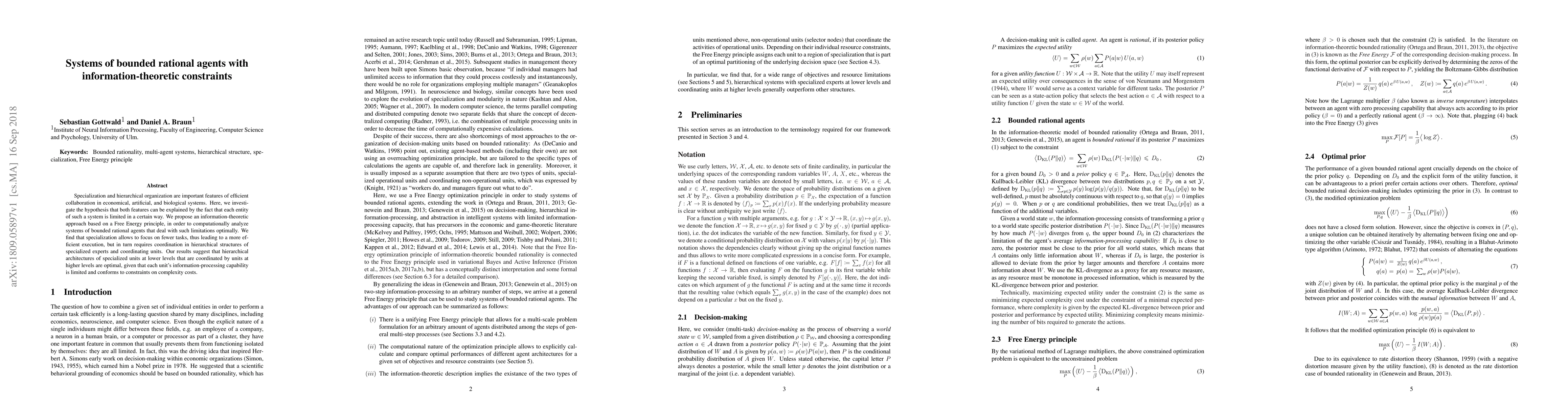 This research proposes an information-theoretic model based on the Free Energy principle to analyze systems of bounded rational agents. It finds that specialization enhances efficiency but necessitates hierarchical coordination, suggesting optimal architectures feature specialized lower-level units coordinated by higher-level units, all within information-processing constraints.