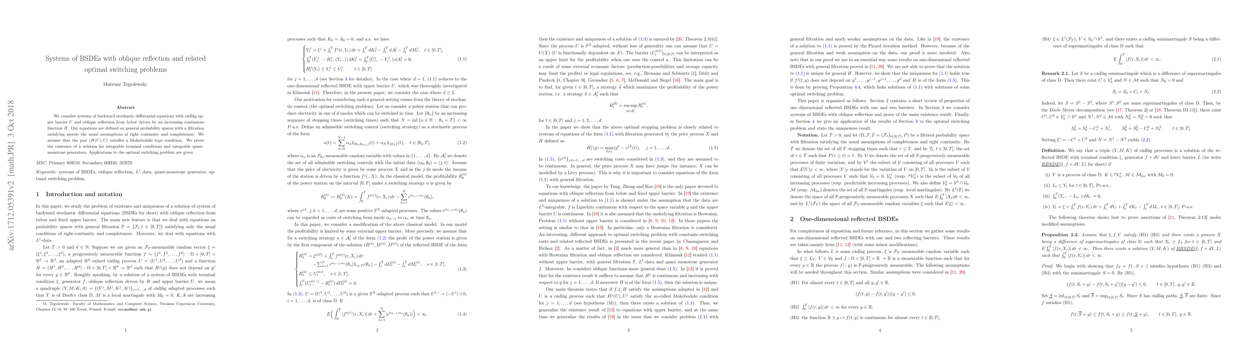 We consider systems of backward stochastic differential equations with c\`adl\`ag upper barrier $U$ and oblique reflection from below driven by an increasing continuous function $H$. Our equations are defined on general probability spaces with a filtration satisfying merely the usual assumptions of right continuity and completeness. We assume that the pair $(H(U),U)$ satisfies a Mokobodzki--type condition. We prove the existence of a solution for integrable terminal conditions and integrable quasi--monotone generators. Applications to the optimal switching problem are given.