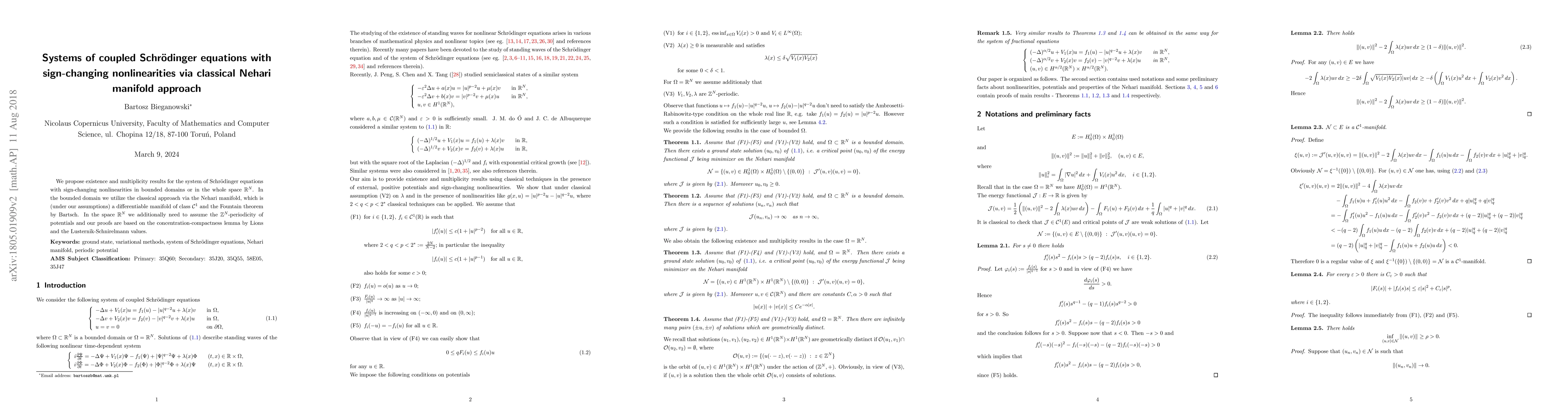 This paper establishes existence and multiplicity results for coupled Schrödinger equations with sign-changing nonlinearities using the classical Nehari manifold approach in bounded domains and $\mathbb{Z}^N$-periodicity assumptions in $\mathbb{R}^N$, employing the Fountain theorem and concentration-compactness lemma.