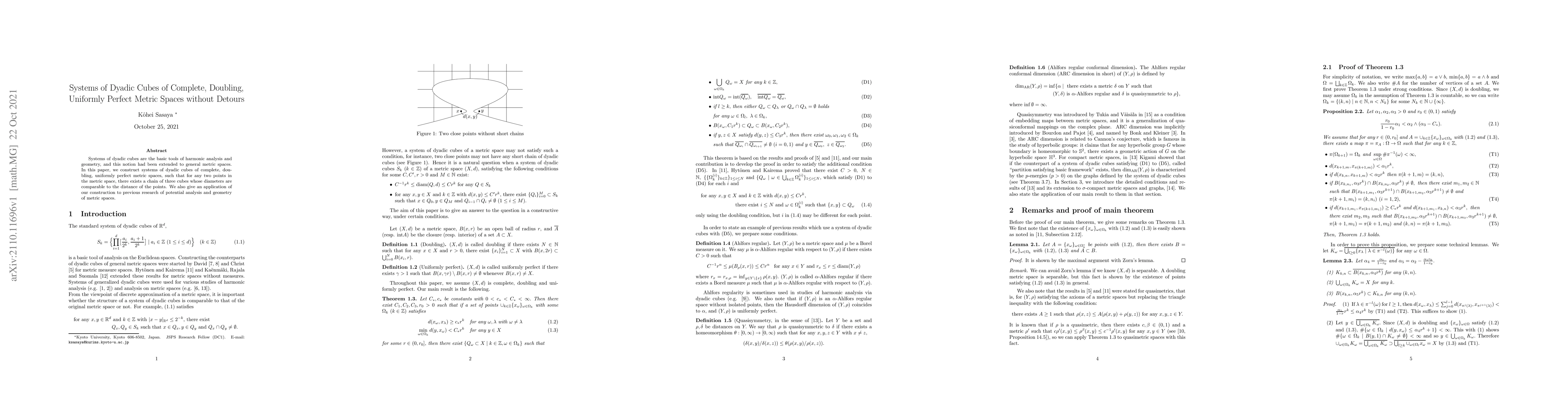 This paper constructs systems of dyadic cubes for complete, doubling, uniformly perfect metric spaces without detours, ensuring a chain of three cubes for any two points. The construction has applications to potential analysis and geometry of metric spaces.