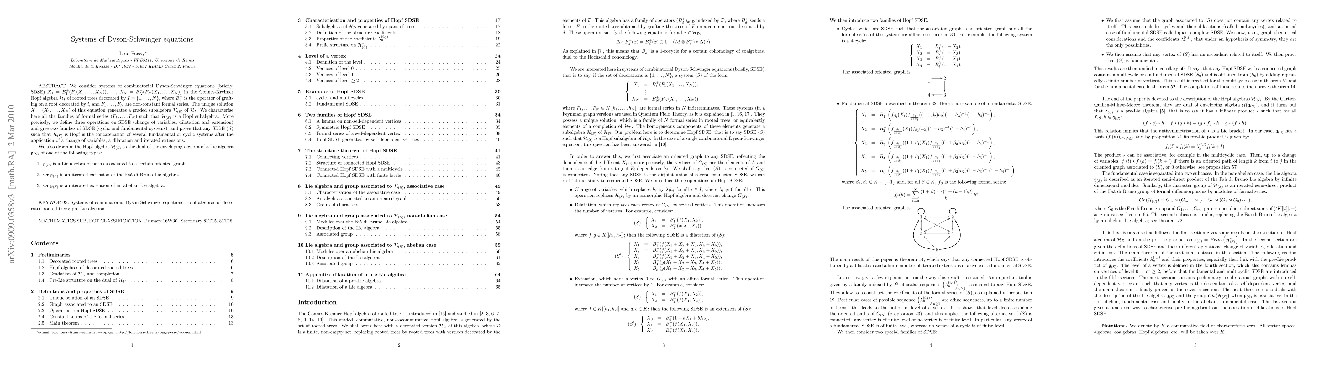This paper explores systems of combinatorial Dyson-Schwinger equations (SDSE) within the Connes-Kreimer Hopf algebra, characterizing families of formal series that generate Hopf subalgebras. It identifies operations on SDSE and proves that any Hopf SDSE is a concatenation of fundamental or cyclic systems after transformations.