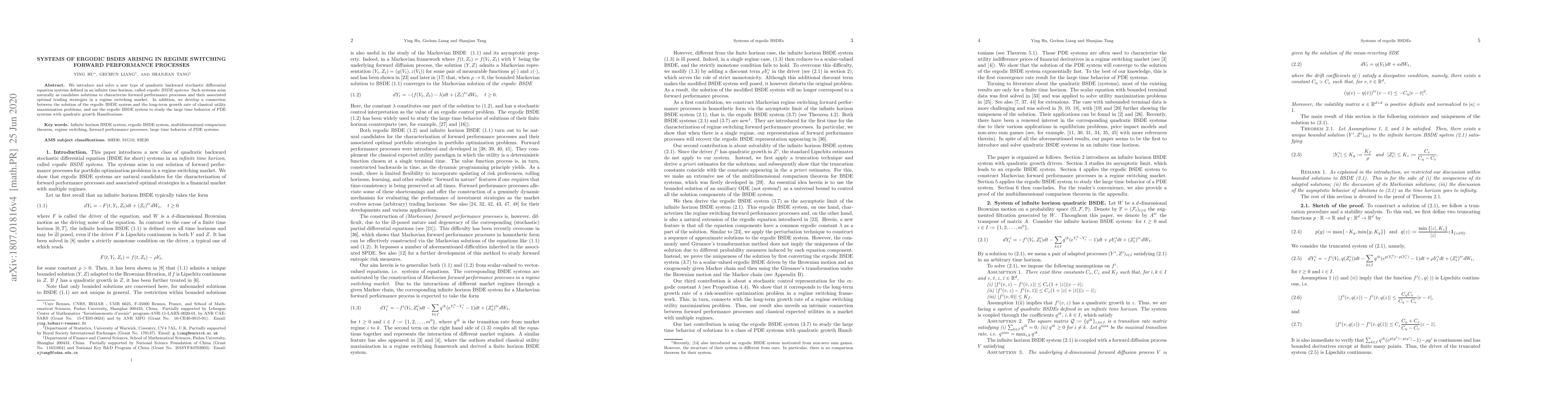 We introduce and solve a new type of quadratic backward stochastic differential equation systems defined in an infinite time horizon, called \emph{ergodic BSDE systems}. Such systems arise naturally as candidate solutions to characterize forward performance processes and their associated optimal trading strategies in a regime switching market. In addition, we develop a connection between the solution of the ergodic BSDE system and the long-term growth rate of classical utility maximization problems, and use the ergodic BSDE system to study the large time behavior of PDE systems with quadratic growth Hamiltonians.